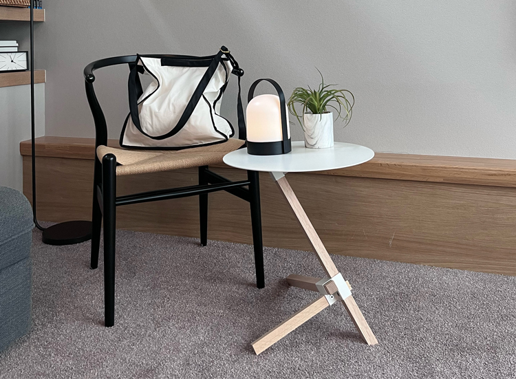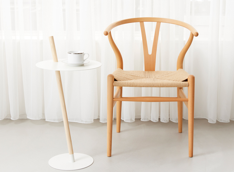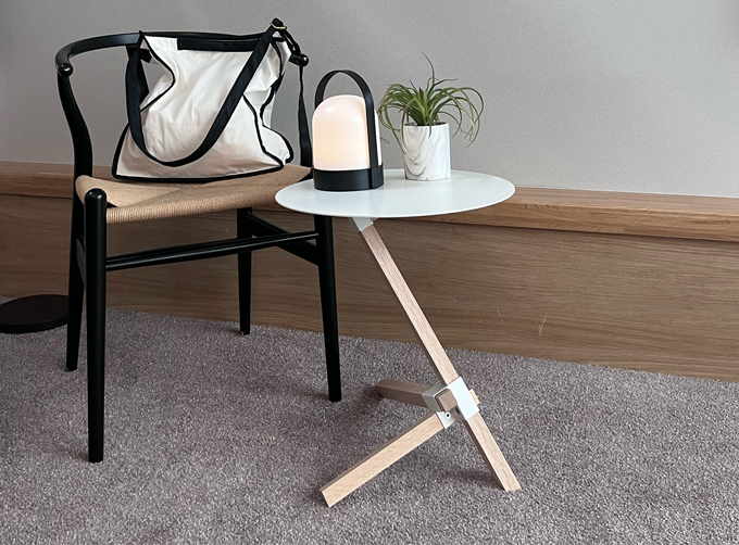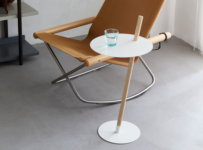 見る角度によって印象が変わるアーキテクトな構造で、まさに小さな建築物のような世界が楽しめるサイドテーブル。スチール製の薄く丸い天板と、オーク無垢材の3本脚が特徴的。サイドテーブルとしてはもちろん、植物や雑貨を飾るディスプレイ台としてもおすすめです。