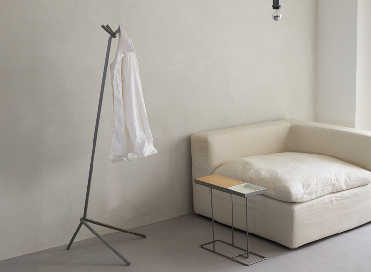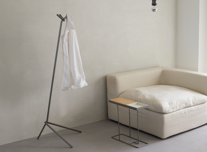家具には珍しい強靭な構造材「無垢の角ロッド」を用いたハンガー。アートの祭典「DESIGNART TOKYO」のフラッグスタンドをルーツに、リモデルを経て誕生しました。アートピースのような存在感を放ち、来客時のインパクトも抜群です。