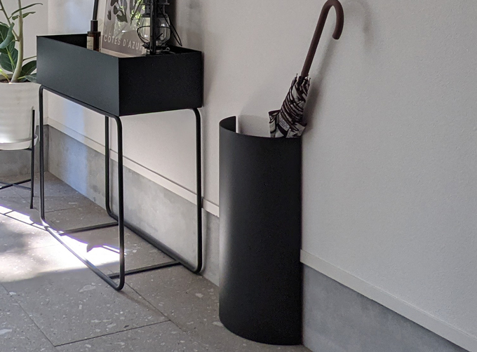 円柱をカットしたようなフォルムが目を惹くフォルム。場所を取らない薄型設計ながら、内部には雨受けも完備しています。雨の少ない季節にはドライフラワーを飾るなど、空間を彩るインテリアとしても活用する一台です。