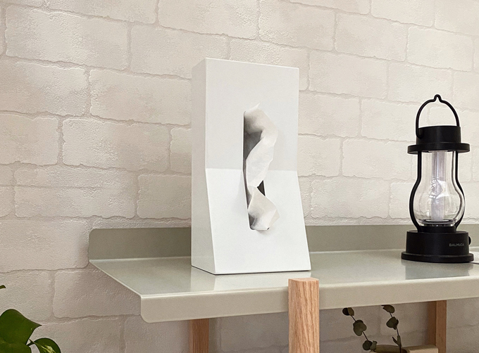 2006年度グッドデザイン賞を受賞した、縦置きティッシュケースの先駆け。手前に傾斜させたデザインは、引き抜く際の転倒を防ぐと同時に、室内を邪魔しない機能美を確立しています。今や定番となったスタイルの原点とも言える、美しさと使い勝手を両立した名作です。