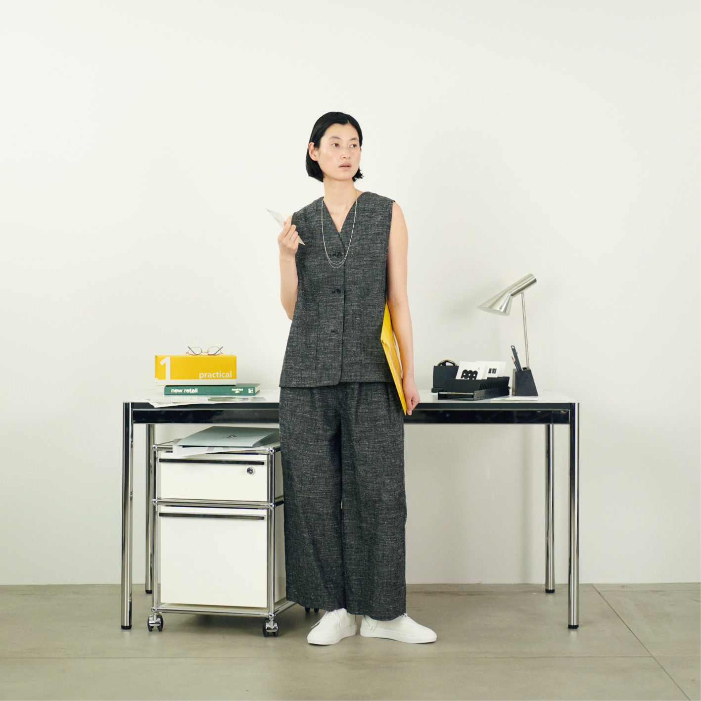 コットン・シルク・レーヨンで織られたツイード生地は軽くてしなやか。オフィスでは、着やすさとスーツ未満な感じが心地良く、カジュアルな場面では、ほどよくルーズに。