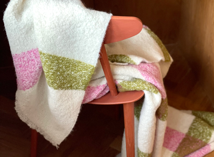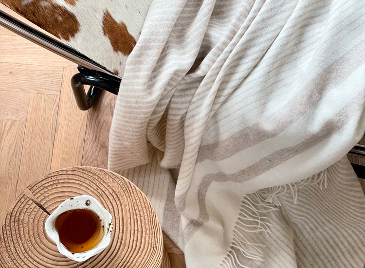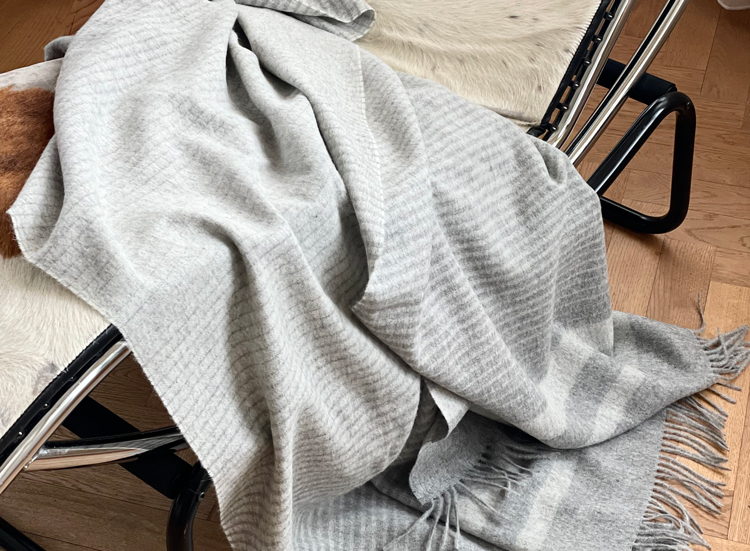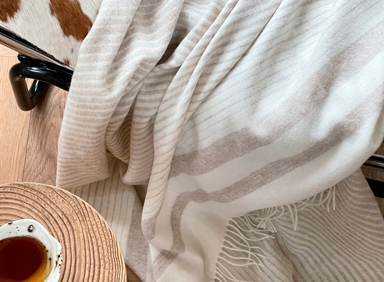 タイムはふんわりとソフトな風合いで、遠くから見ると均一に見えるデザインですが近くで見ると流れるような生地感です。四辺が美しいフリンジで囲まれたスローは、ダブルフェイスのカラーリング。
