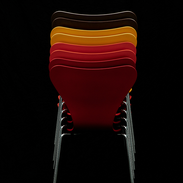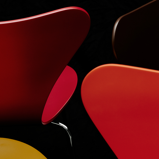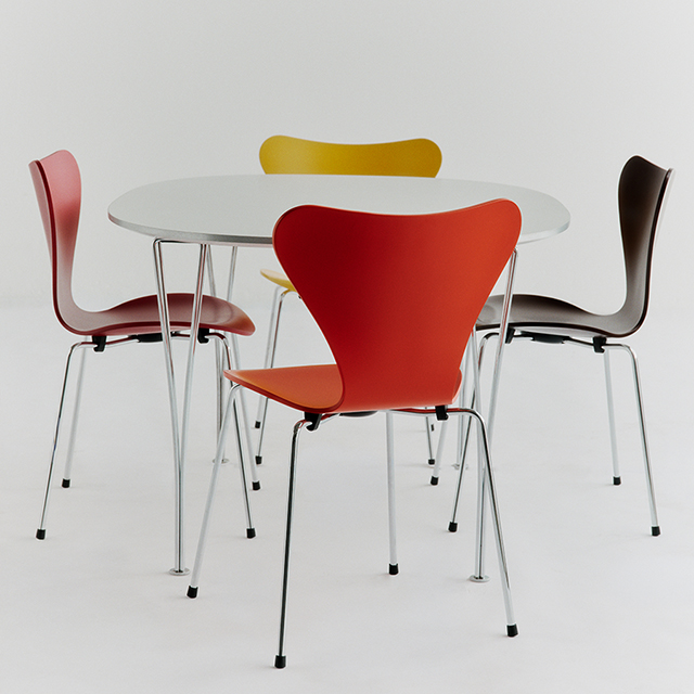 アルネ・ヤコブセンにより1955年にデザインされたセブンチェアは、フリッツ・ハンセン社を代表するベストセラーであると同時に、家具の歴史におけるアイコン的存在です。特徴的なこのチェアのフォルムは、タイムレスかつ多用途で、飾ることなく個性的です。9層のベニヤで構成される成形合板のシェルは、そのスレンダーなフォルムに強度と柔軟性、耐久性を備えています。曲線的なシェルのシルエットを際立たせる、華奢でありながらも丈夫なスチールパイプ製のベースが特徴的なセブンチェアの3107モデル。ベースはシートの外側に向けて少し広がっているため、簡単に一列に並べたり、スタッキングしたりすることができます。目立たないようにとシート下のディスクにマウントされたベースがヤコブセンデザインのクリーンでミニマルな美学を一層引き立てます。