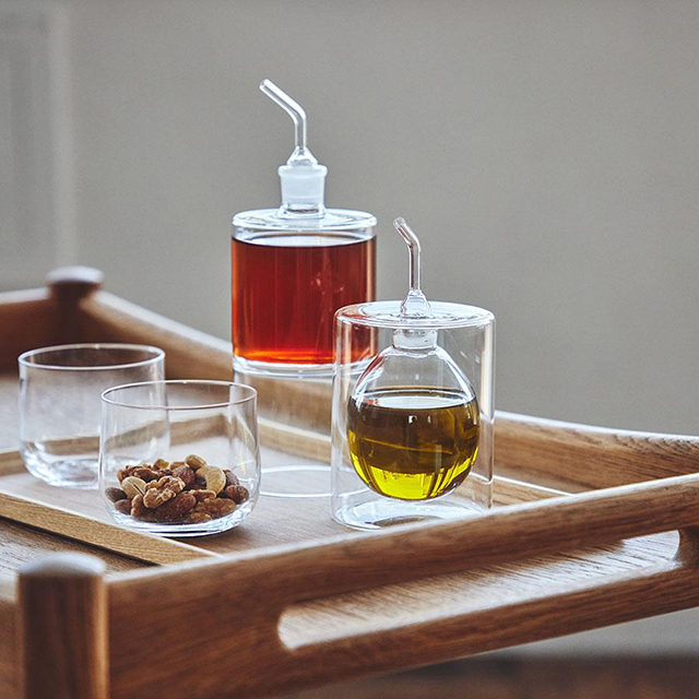 まるでオイルが宙に浮いているかの様に見える、2重構造になったユニークなオイル&ビネガーボトルです。注ぎ口のノズルは細く作られているので、量を調整しやすくピンポイントで注ぎやすいのも特長です。食卓やキッチンに置くだけでオシャレな雰囲気になります。