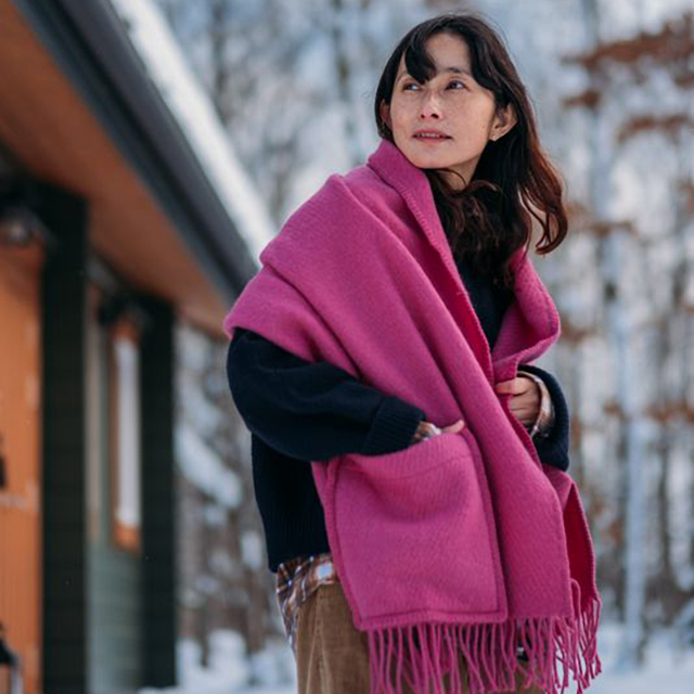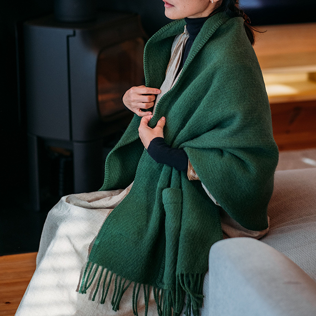 日々の生活に溶け込む手軽さと、羽織るだけでスタイルアップしてくれるファッション性が魅力のポケットショール。ひざ掛けとしてやアウターとして、ウールの調湿効果の高さから夏以外のどの季節も快適にお使いいただけます。