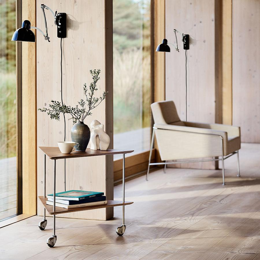 アルネ・ヤコブセンが自身のティータイムのためにデザインした精巧で建築的な雰囲気をも備えたこのエレガントなトロリーは、時を超えてモダンで実用的なアイテムであり続けます。