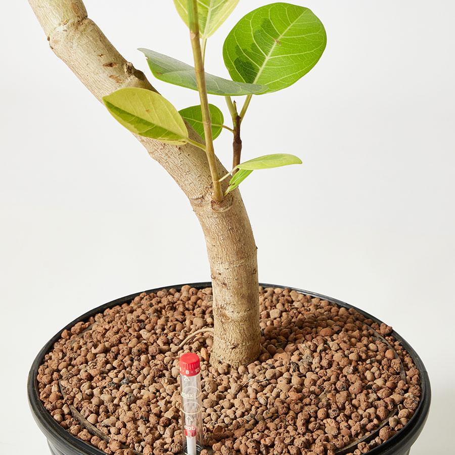 土を使わない「ハイドロカルチャー」仕様でお届けします。黒のプラスチック鉢(インナーポット)に植え込まれており、そのまま飾っていただくことはもちろん、別売りの鉢カバーやスタンドと組み合わせて、インテリアとのコーディネートをお楽しみいただけます。