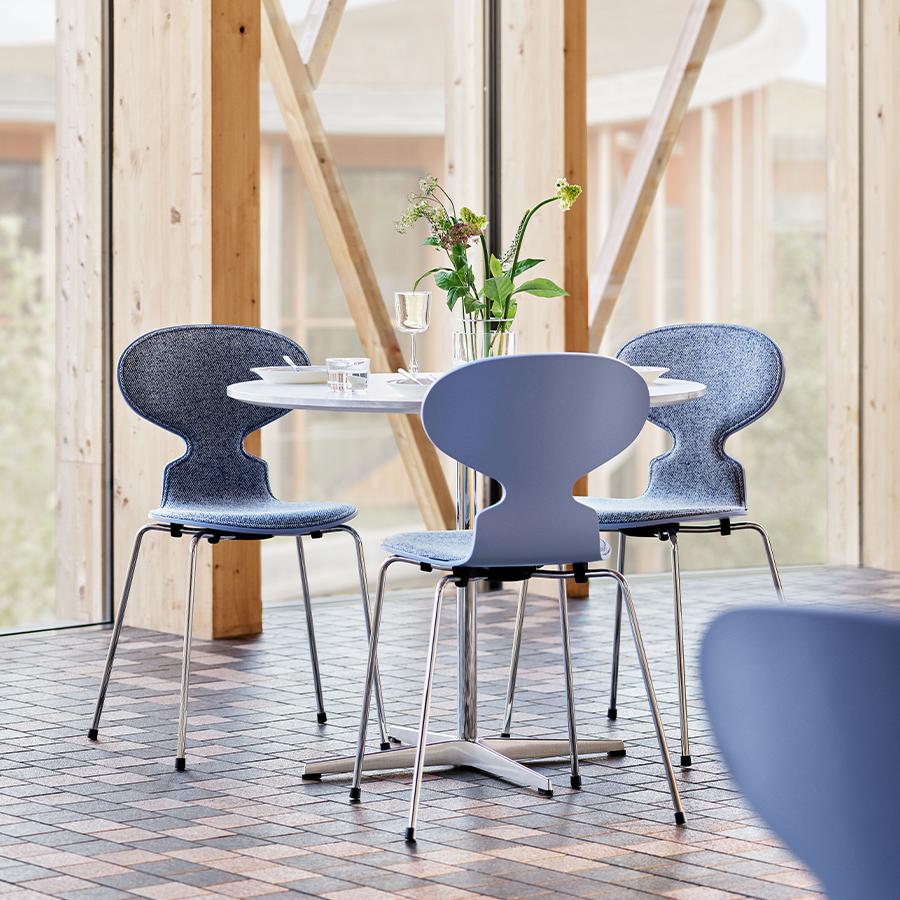 アルネ・ヤコブセンがデザインしたスタイリッシュな4スターベースとの視覚的なシンメトリーが目を引くスーパー円テーブル。特徴的でありながらも控えめなデザイン効果を生み出す4スターベースは、椅子を2脚セットしても余裕の広々とした足元の空間とともに、心地よいダイニング体験を叶えます。