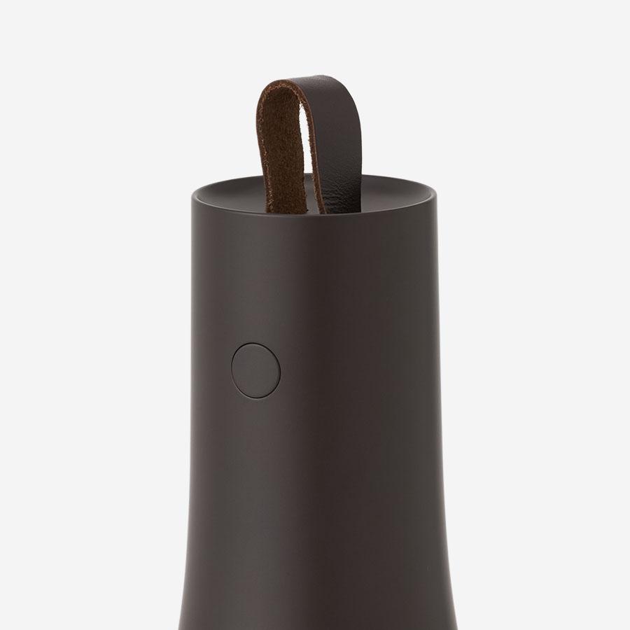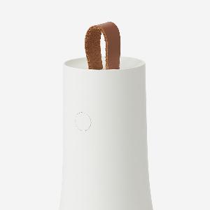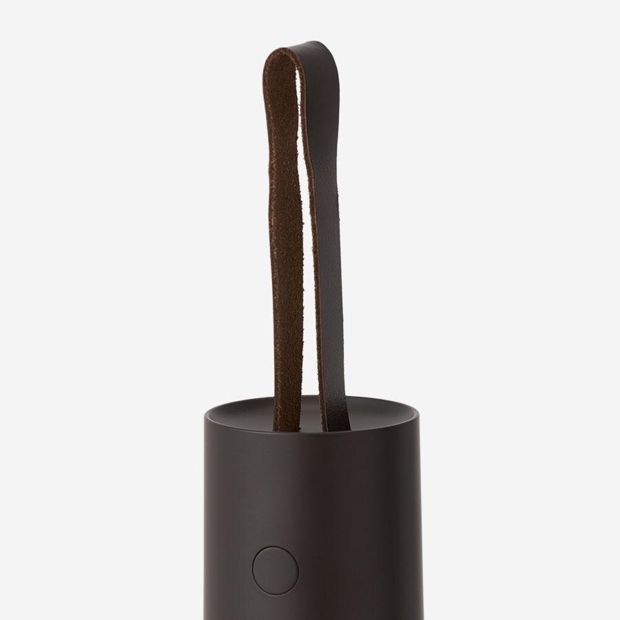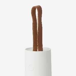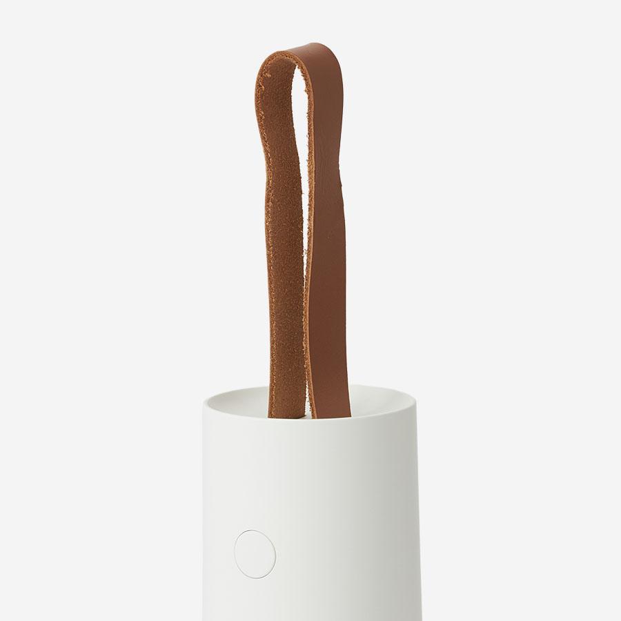 トモシの魅力は、好きな場所に置くだけでなく、本革のストラップを使い壁面やコートラックなどに引っ掛けるなど、自由に光を灯すことができるところ。ストラップがついていることで、持ち運びがしやすいのも魅力です。滑らかな曲線を描くデザインは、どんな空間にも馴染みます。