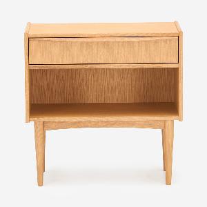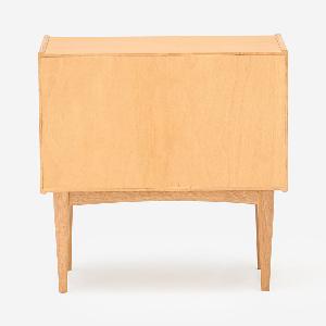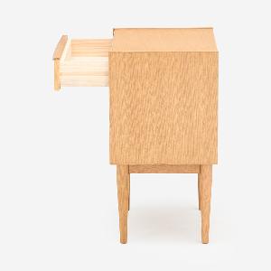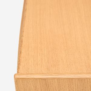 衣類や小物の収納に役立つコンパクトチェストです。寝室のベッド脇やリビングのちょっとしたスペースに置きやすいサイズです。チェスト本体には縦に伸びる木目が美しい柾目を使い、オーク無垢材を削り出した取っ手が華やかさを添えています。