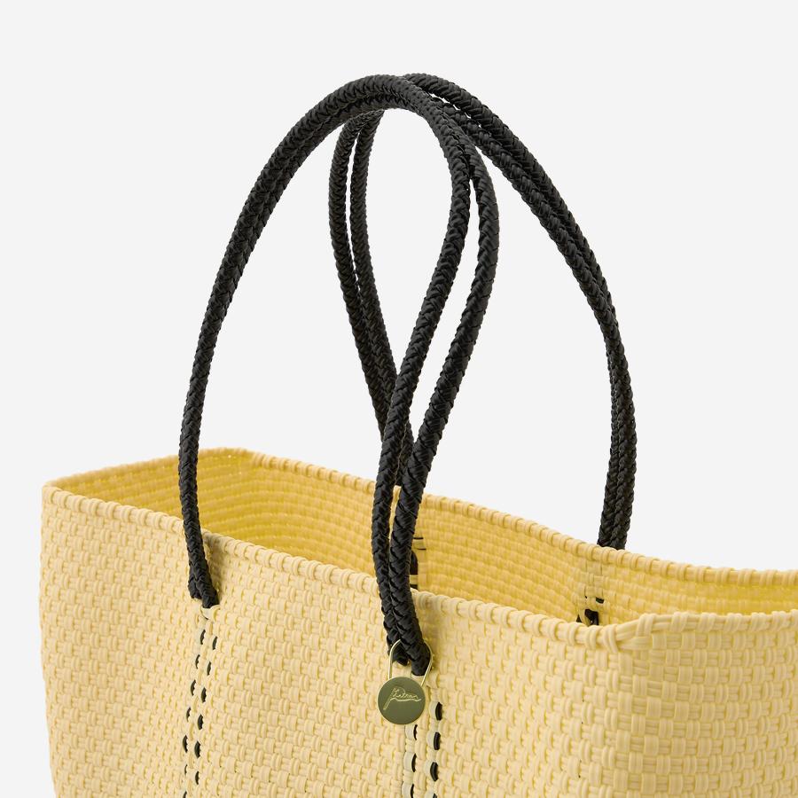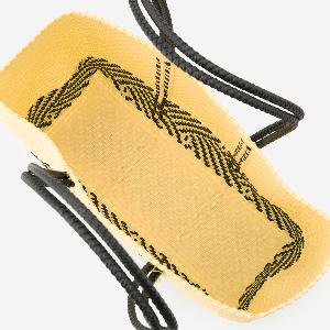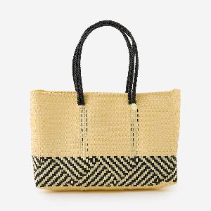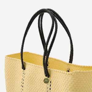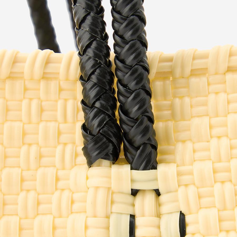 本体からハンドル部分にいたるまで紐がしっかりと編み込まれており、とても丈夫に作られているバッグは、水に濡れても平気な素材でできているため、水洗いも可能です。