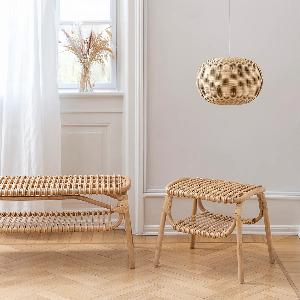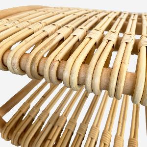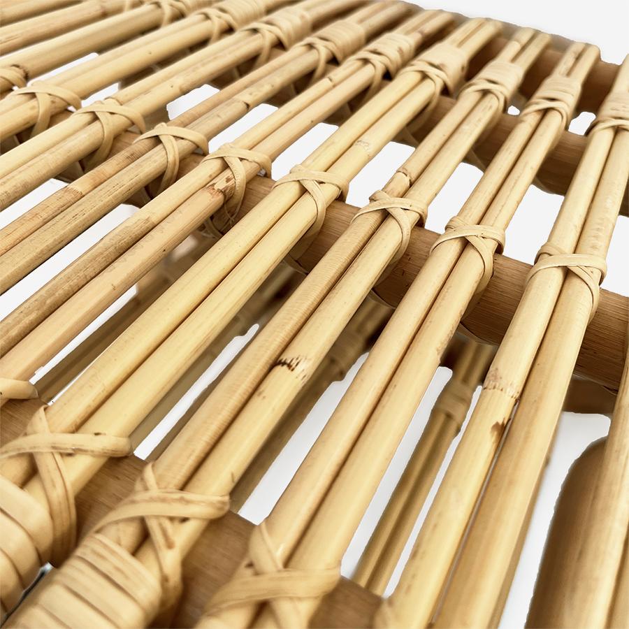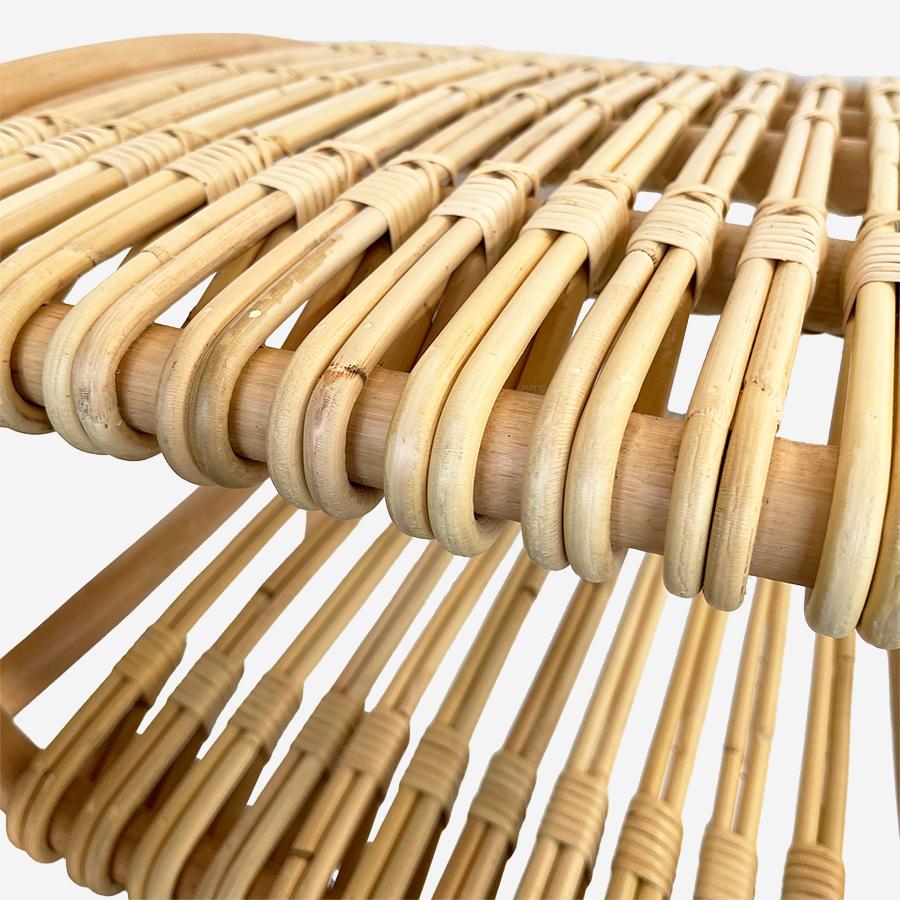この美しい造形を支えるのは、熟練職人の手仕事です。600種類ある籐のなかでも最高級品種の「トヒティ」と「マナウ」ラタンを使用し、蒸気で曲げ、成形する伝統技法によって一つひとつ丁寧に作られています。