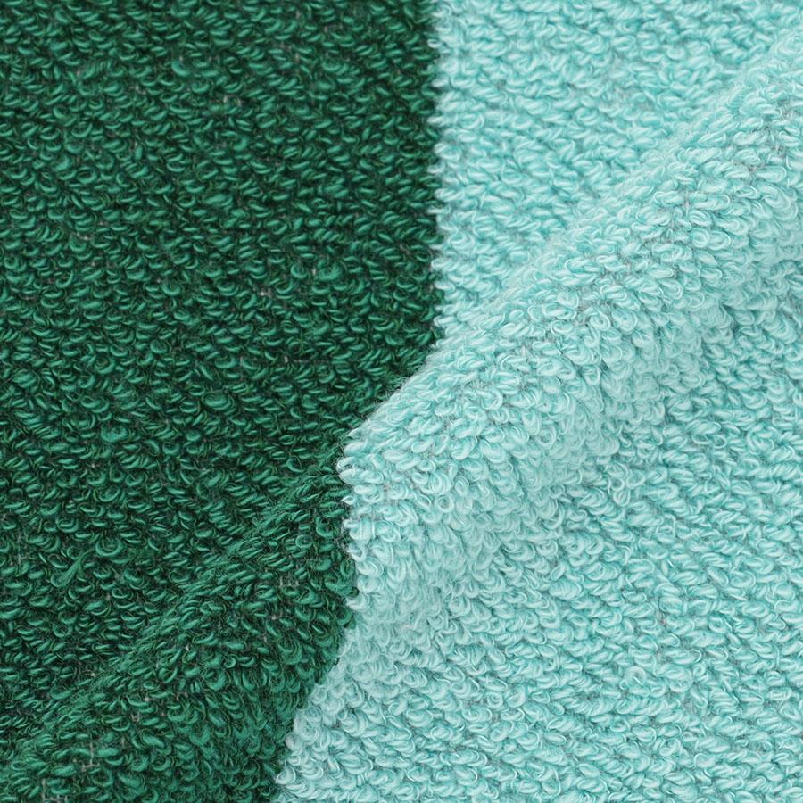 バンブーレーヨンと綿の糸の染まり具合の差を利用することによって、同色の中に光沢感と深みのあるカラーを表現しています。