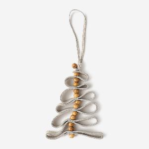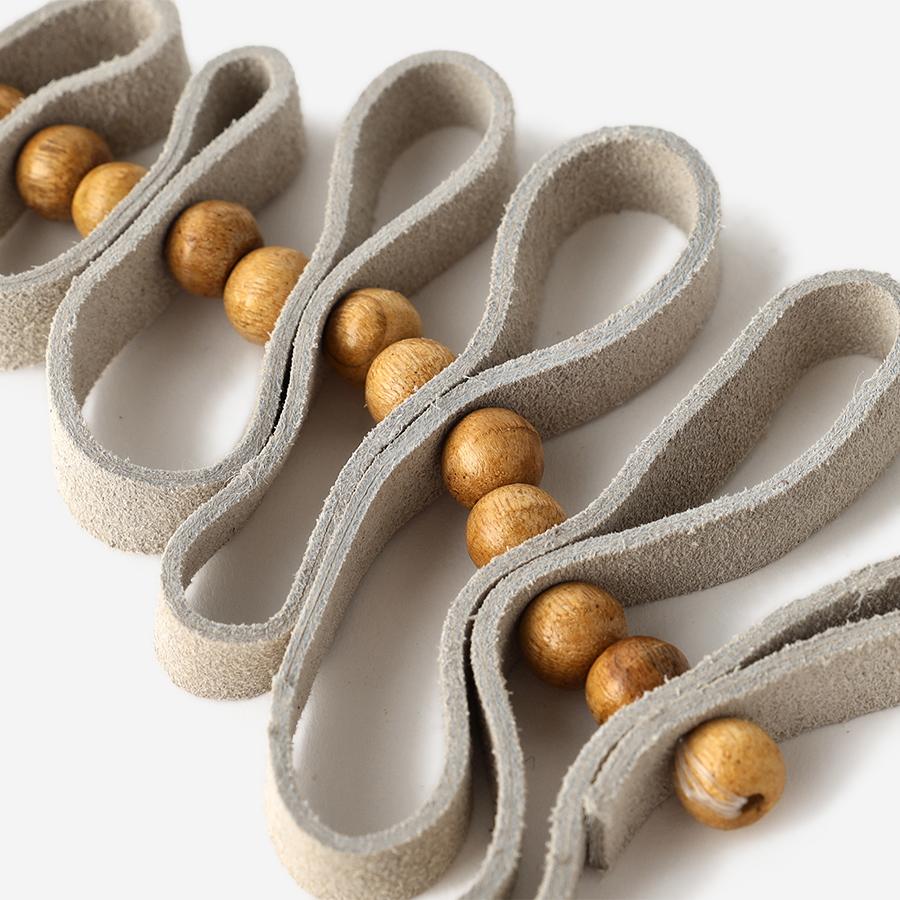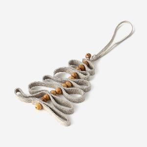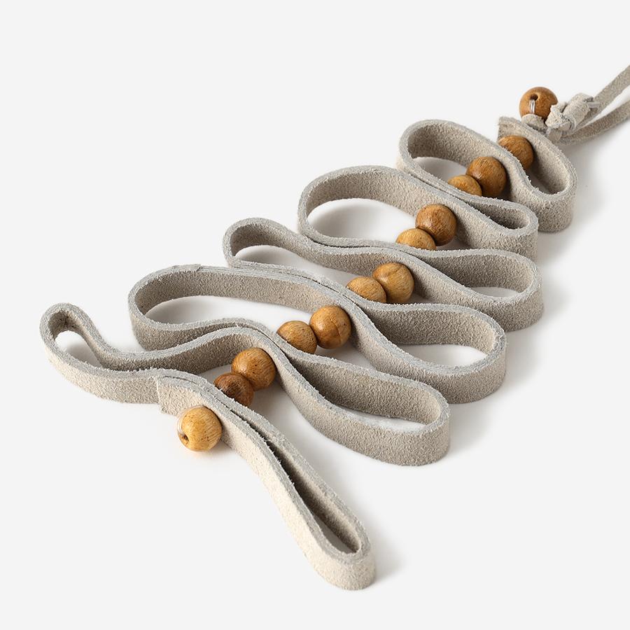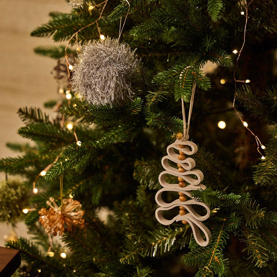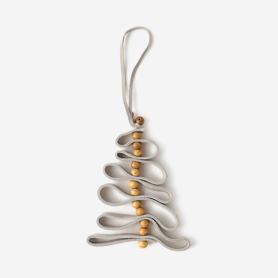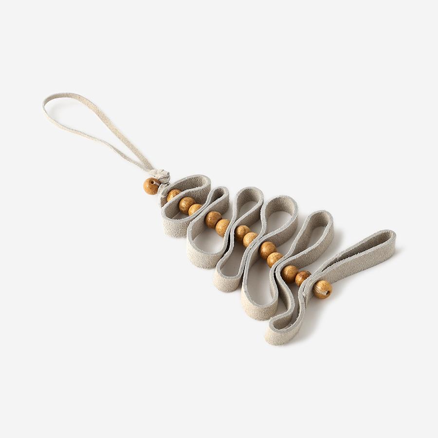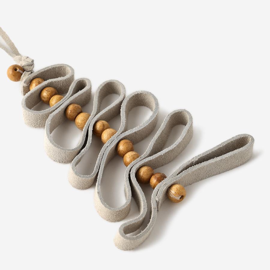 柔らかなスエード素材(レザー)をリボンのように折り重ね、ナチュラルなウッドボールをアクセントに組み合わせた、温かみあふれるツリー型オーナメント。