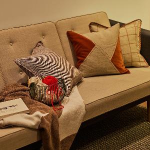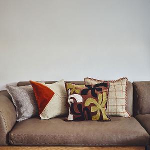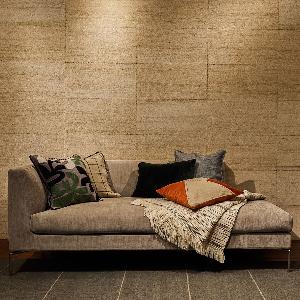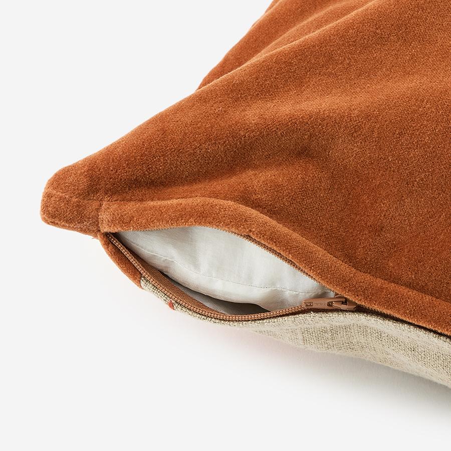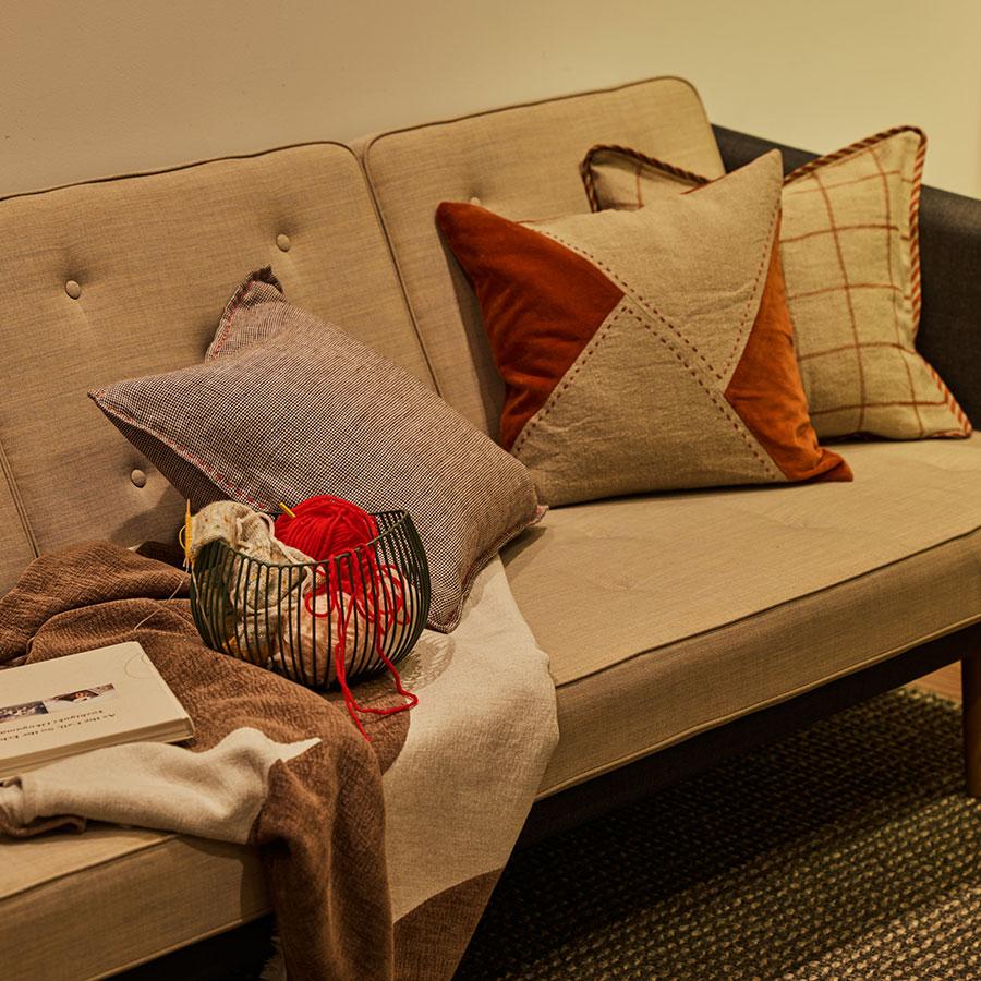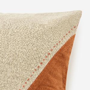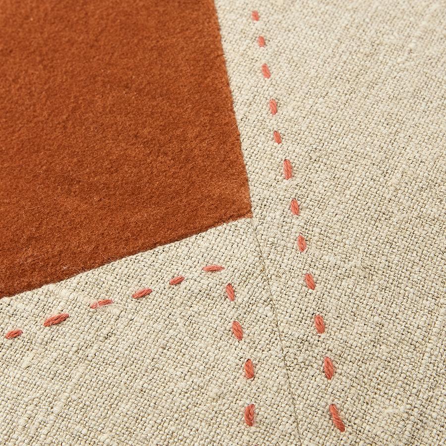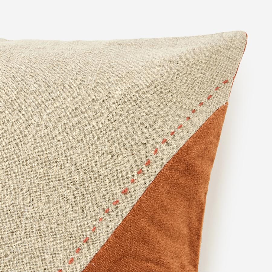 表面には、温かみのあるベルベットとナチュラルな風合いのリネンを組み合わせ、幾何学的なデザインに仕上げられています。ハンドステッチ風のアクセントが加わり、クラフト感のある表情を演出。