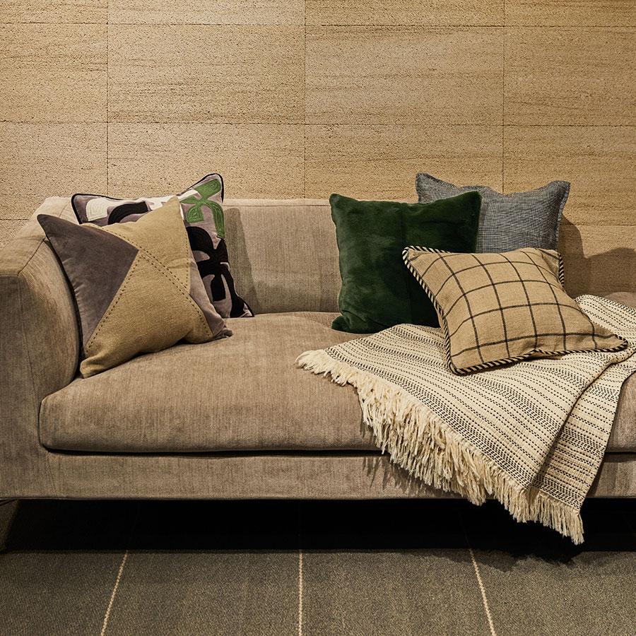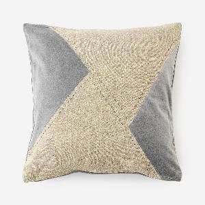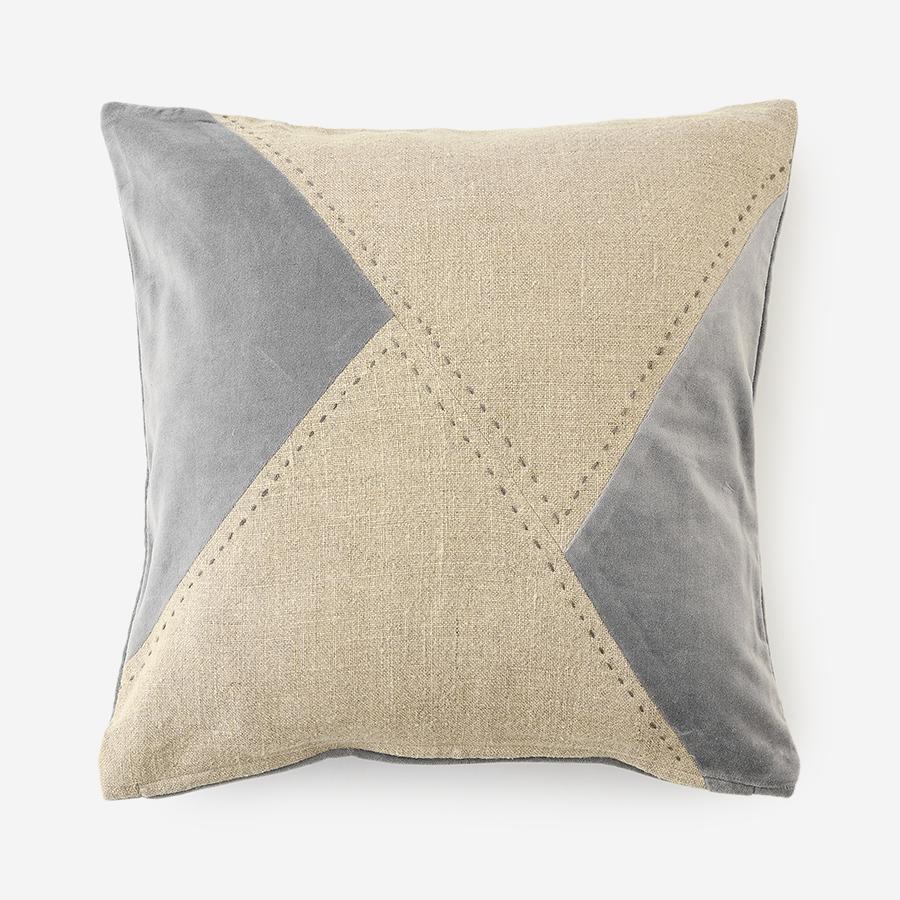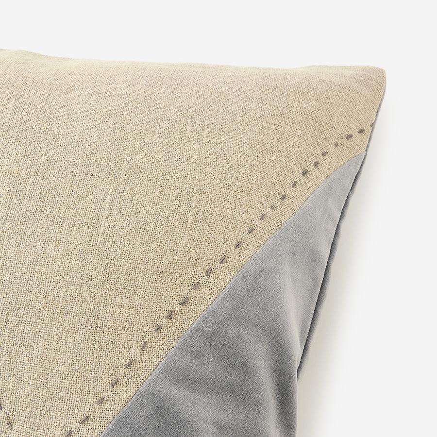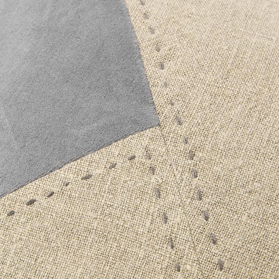 表面には、温かみのあるベルベットとナチュラルな風合いのリネンを組み合わせ、幾何学的なデザインに仕上げられています。ハンドステッチ風のアクセントが加わり、クラフト感のある表情を演出。