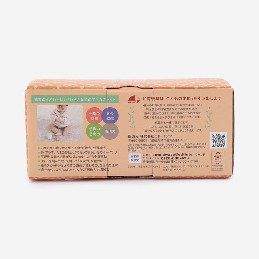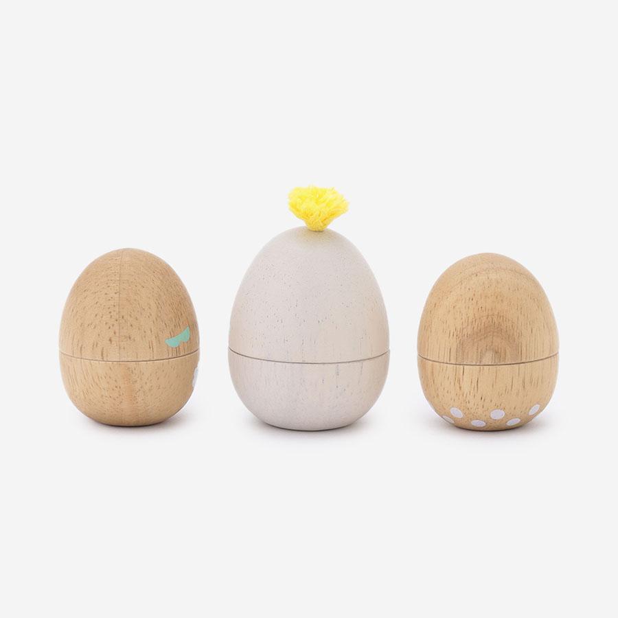 3つのたまごは、それぞれ「カラカラ(ビーズ)」「リンリン(鈴)」「ピヨピヨ(笛)」と異なる音が鳴る仕掛けになっています。
