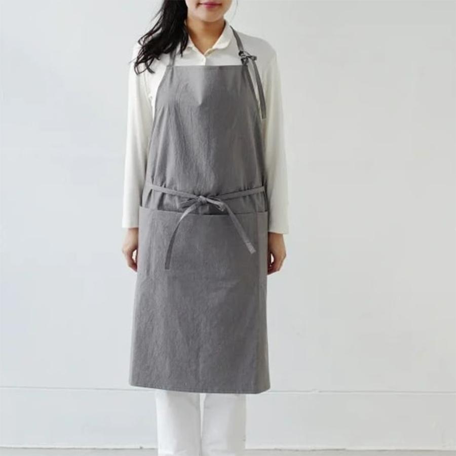 胸当て部分を腰ひもの位置で折りたたむとギャルソンエプロンとして、また雰囲気の違ったスタイルをお楽しみいただけます。腰のヒモで上下の位置を調整するようにお使いいただくと首周りのヒモのストレスはなくお使いいただけます。