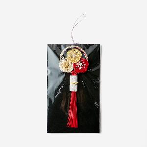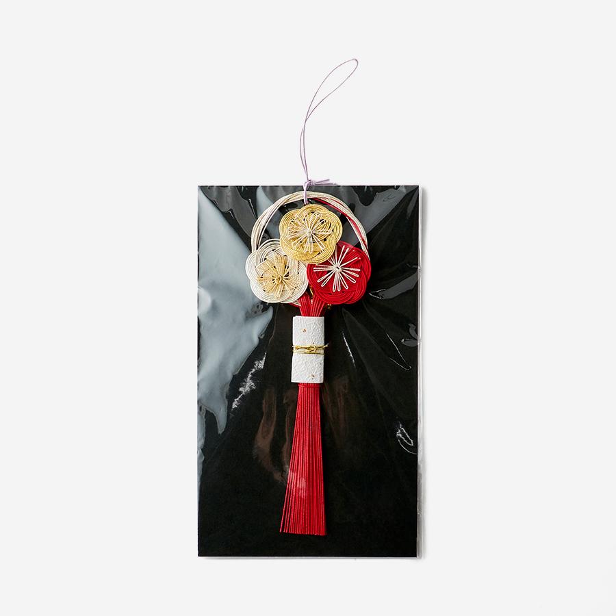 赤、白、金の三色の水引で結ばれた梅の花が寄り添うデザインは、可愛らしくもあり、凛とした気品も漂わせます。
