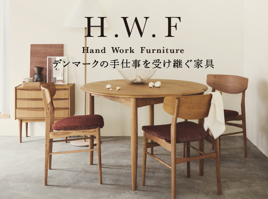 1950年代から70年代にデンマークで生産され、多くの家庭で長く愛されてきた中古家具が今、素朴な意匠と実用性から日本をはじめ韓国やアメリカなどで人気を博しています。アクタスでは北欧からこれらの中古家具を数多く輸入し、国内でリペアしてご提供してきました。その過程で培った技術を用いて、想いやこだわりを現代に受け継いでいくために作られた家具シリーズが「H.W.F」です。