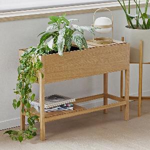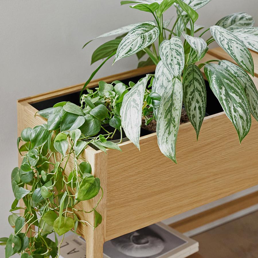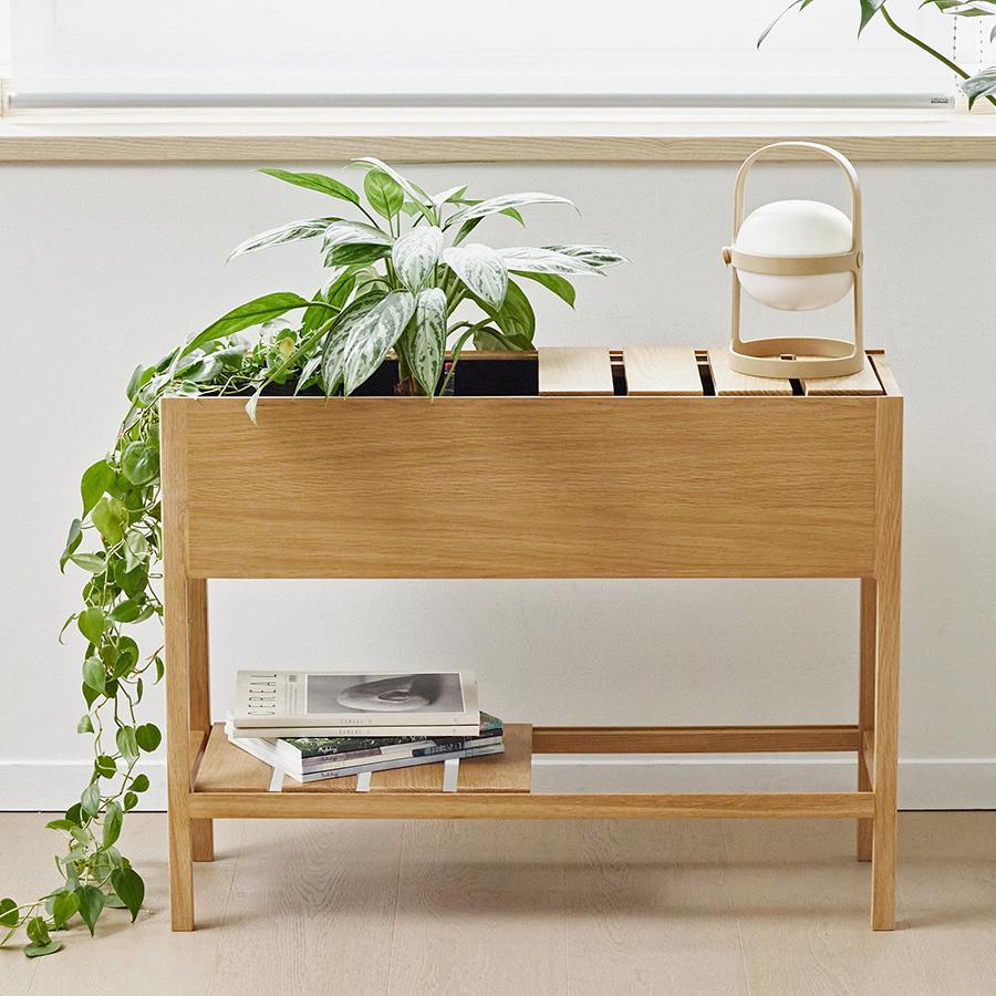 観葉植物をディスプレーするプランターとしてはもちろん、ソファやベッドの横に置いてサイドテーブル、ナイトテーブルとしてお使いいただけます。またソファ後ろのデットスペースへの収納家具など、様々なシーンで便利にお使いいただくことができる便利な収納家具になります。