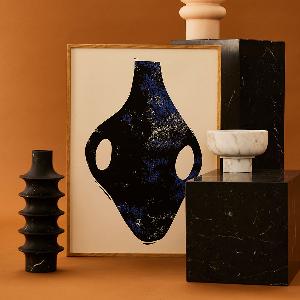 伝統的なスクリーンプリントの技法から着想を得た独特のテクスチャーが特徴であり、それぞれの作品に表現された流れるような柔らかな有機的フォルムが、大胆でありながらも見る者の心を穏やかにする魅力的なコントラストを生み出しています。
