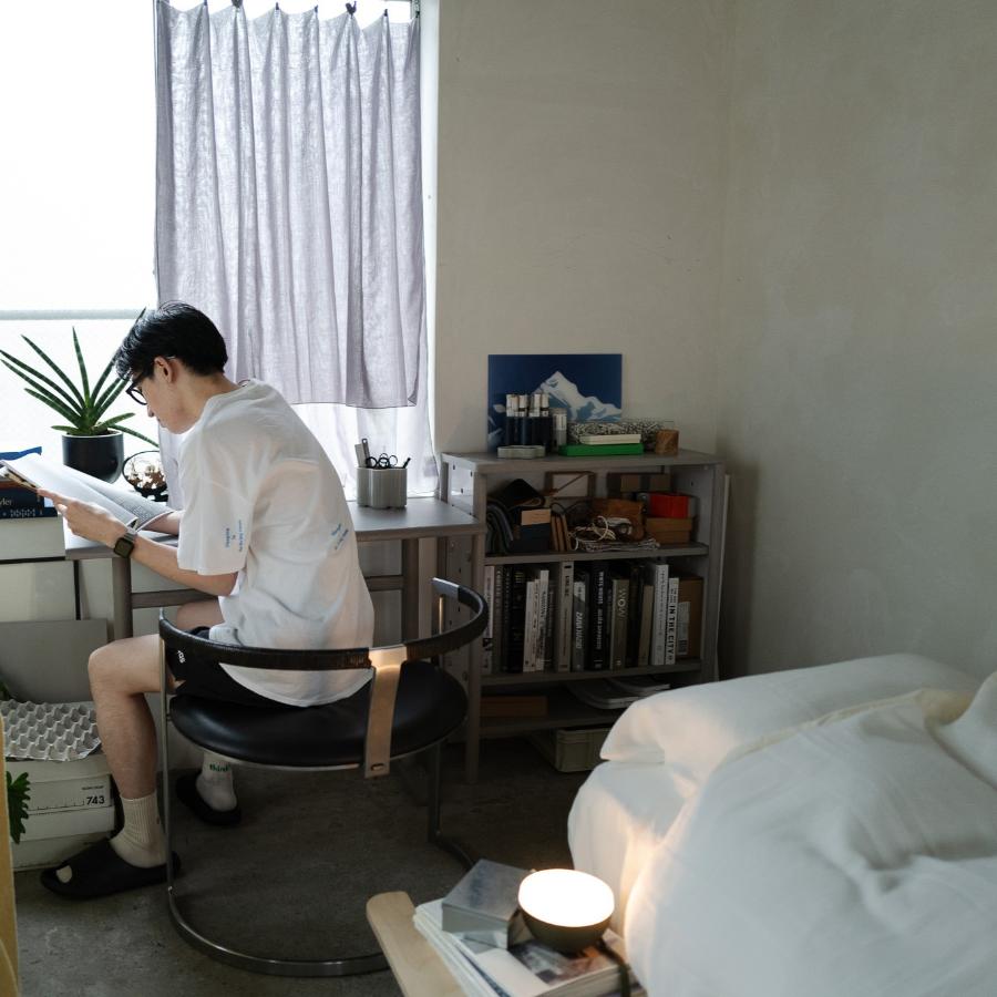 背面を斜めに支えるスチールバーは、1本のみで構造を十分に支えて安定させるミニマルなデザイン。