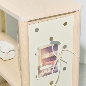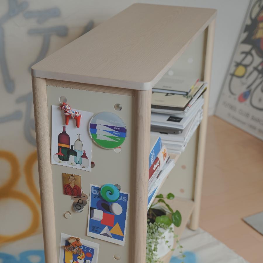 穴にフックをかけて、かばんを掛けたり、マグネットでポストカードをくっつけたりと小さなスペースを目一杯活用することが出来ます。