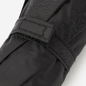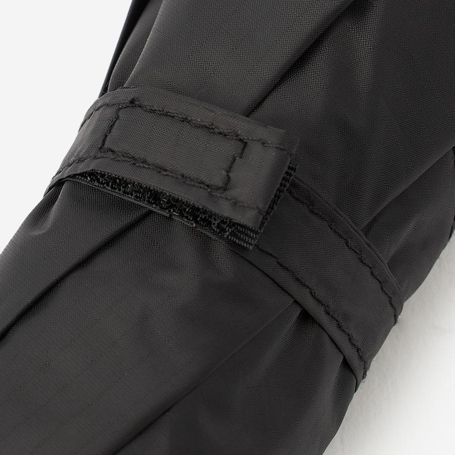 ブラックで統一されたシンプルでスタイリッシュなデザイン。ロゴもさりげなくブラックで配し、スマートさを追求しました。収納袋はスリット入りで出し入れしやすく、カラビナ付きで濡れた傘をバッグの外に掛けて持ち運べる実用性も兼ね備えています。