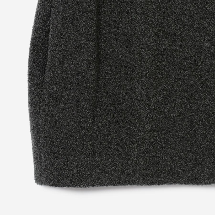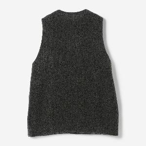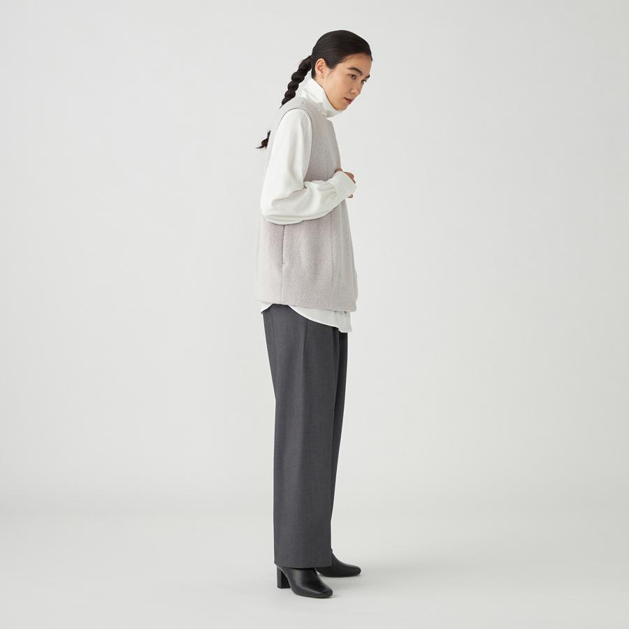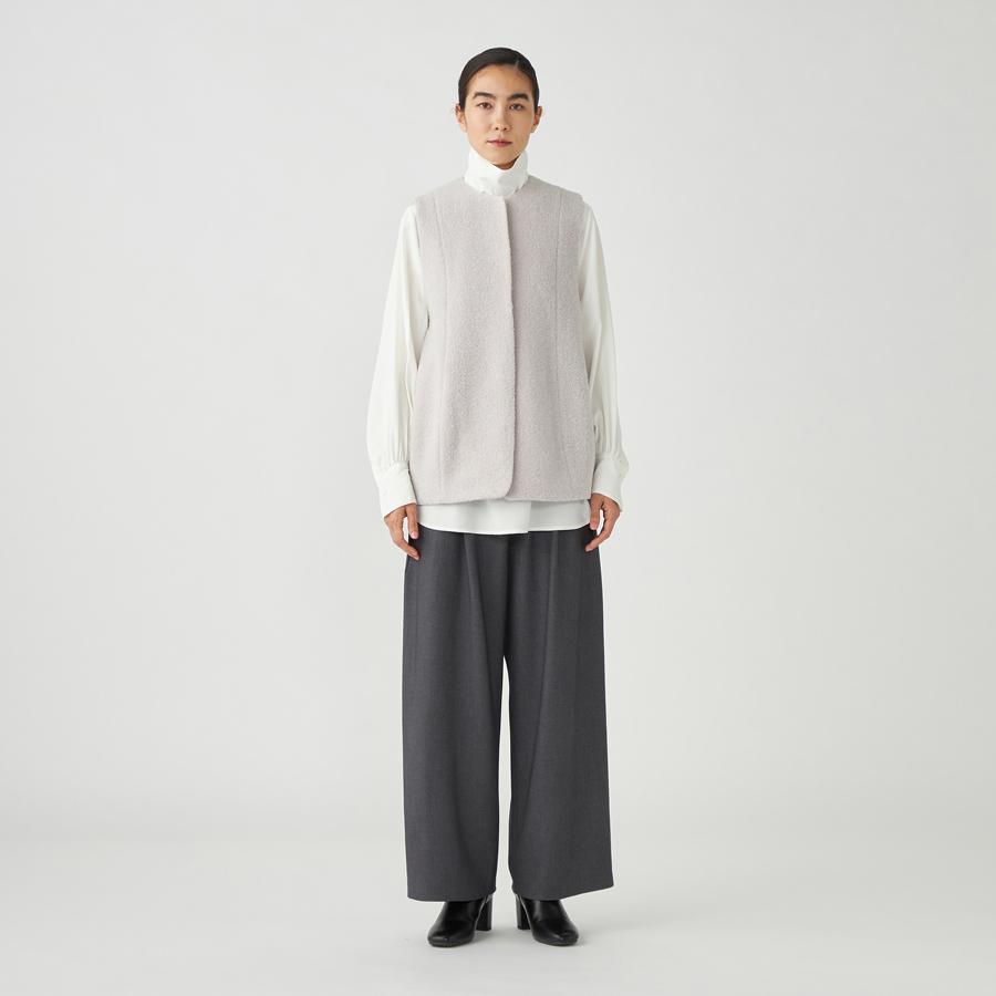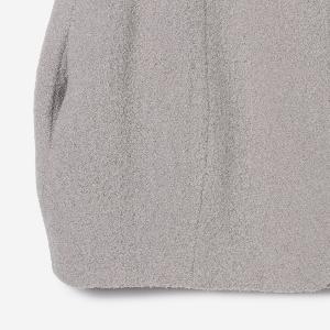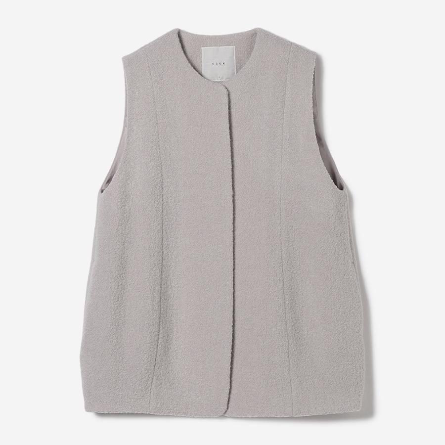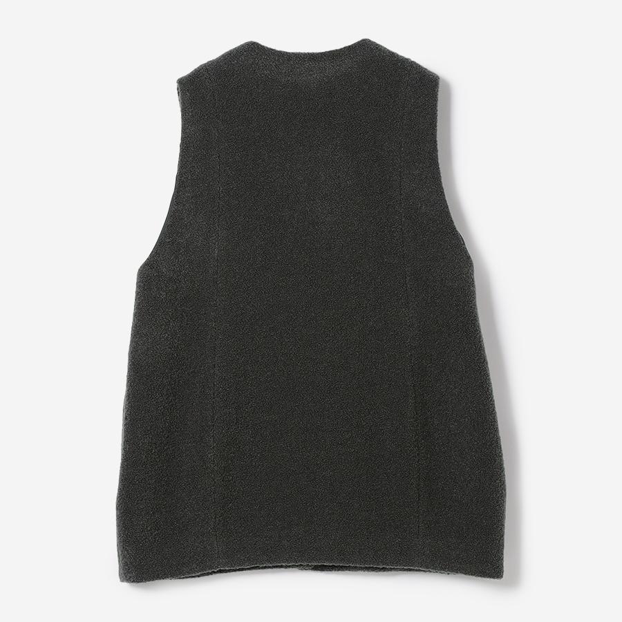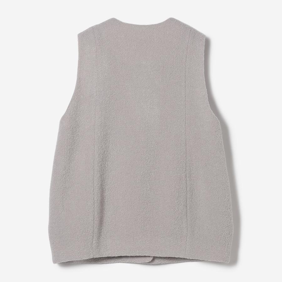 ミニマルなジレ。ポケットや釦は表から見えない様に仕立て、ループ状のテクスチャーが際立つ様にデザインされたアイテムです。