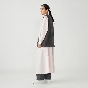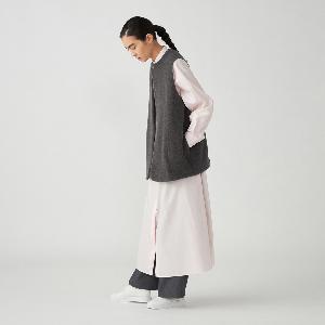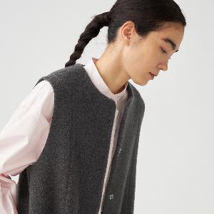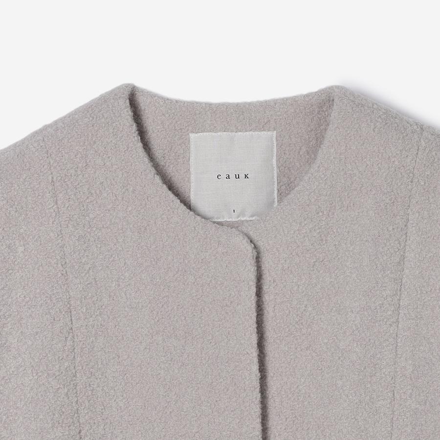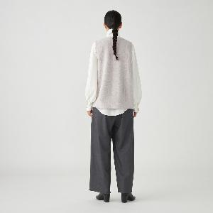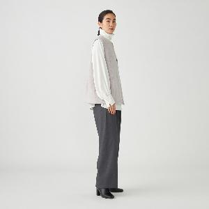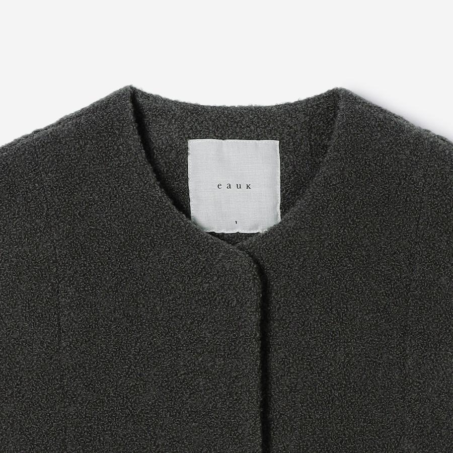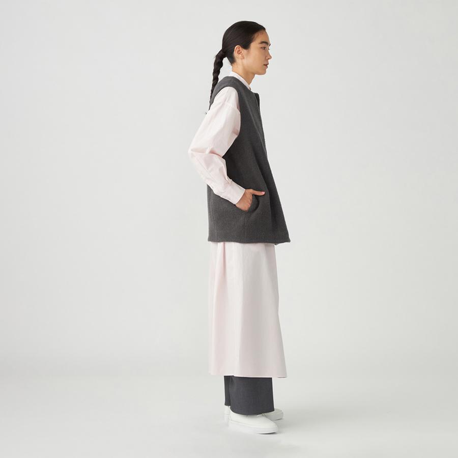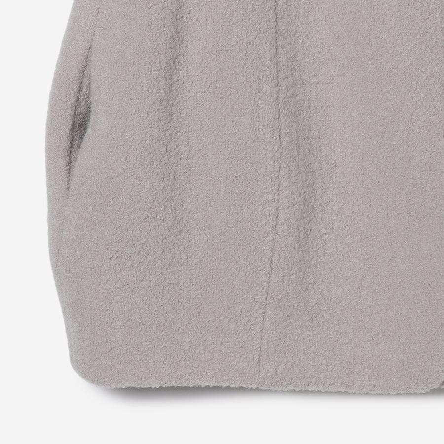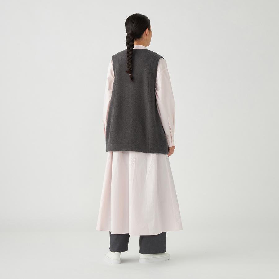 ミニマルなジレ。ポケットや釦は表から見えない様に仕立て、ループ状のテクスチャーが際立つ様にデザインされたアイテムです。