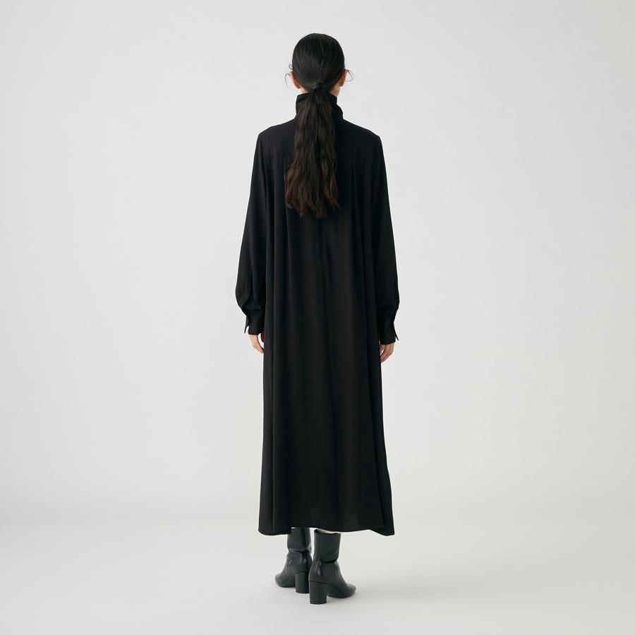 スタンドカラーのギャザードレス。胸元にギャザーが入り、顔周りを華やかに見せてくれます。