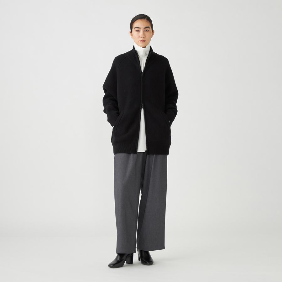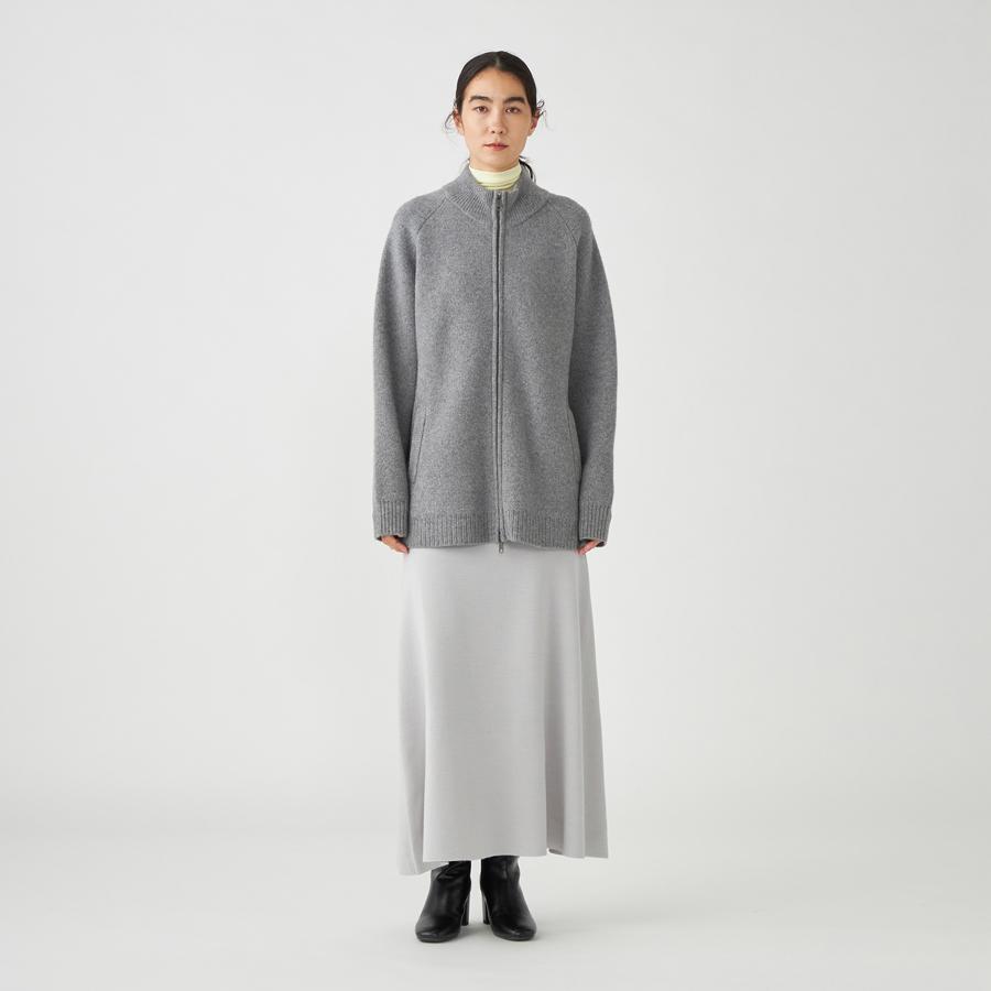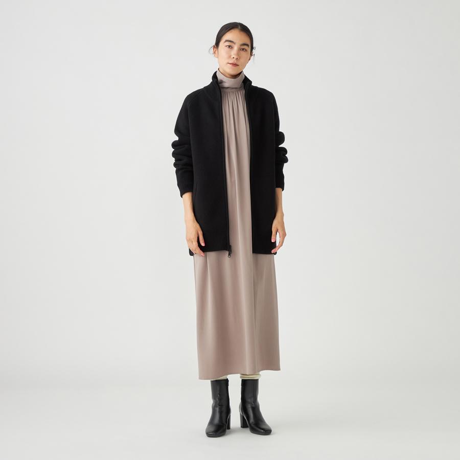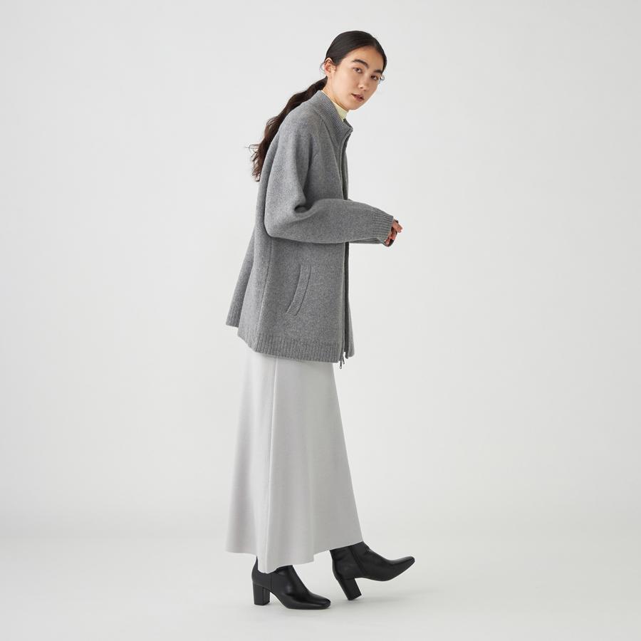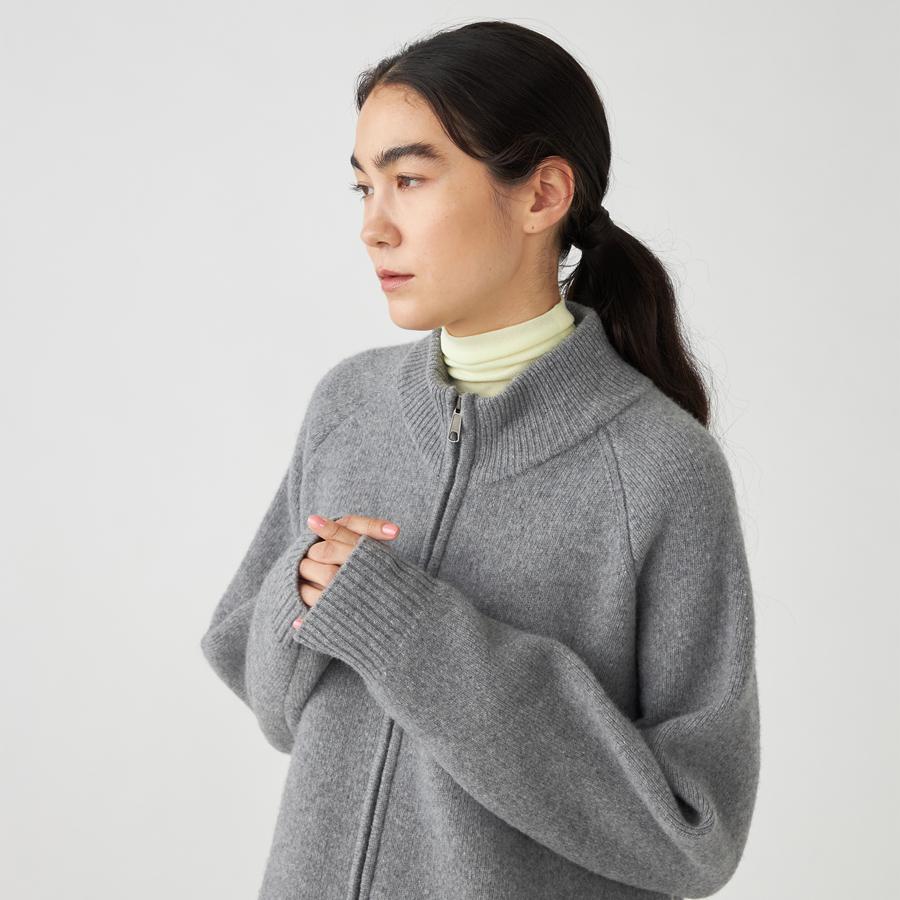 ジップアップのニットアウター。カーディガンとアウターの中間くらいのイメージでお作りしているので長い期間着用いただけます。