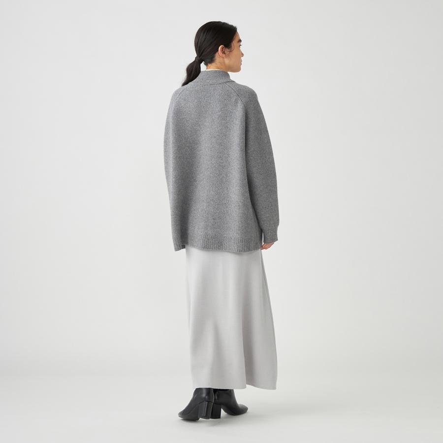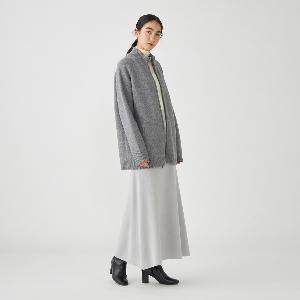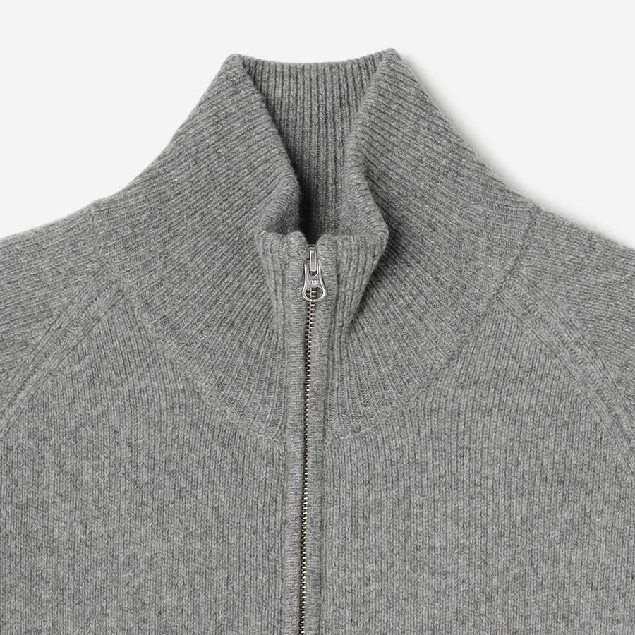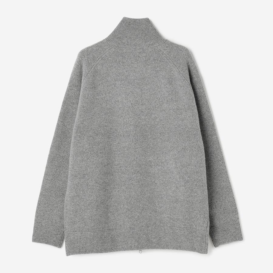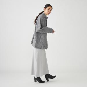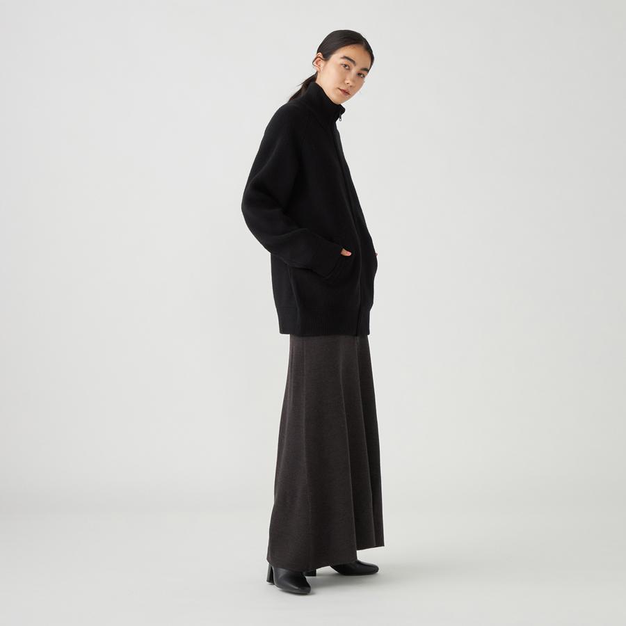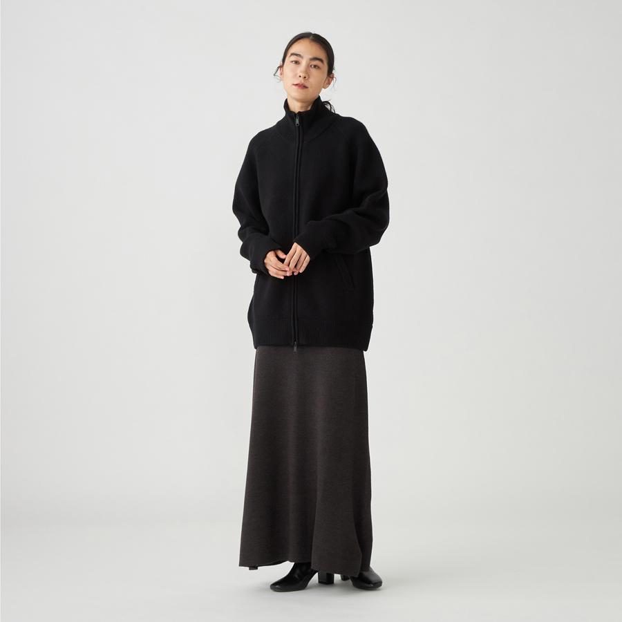 ジップアップのニットアウター。カーディガンとアウターの中間くらいのイメージでお作りしているので長い期間着用いただけます。