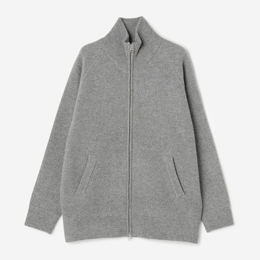 ジップアップのニットアウター。カーディガンとアウターの中間くらいのイメージでお作りしているので長い期間着用いただけます。
