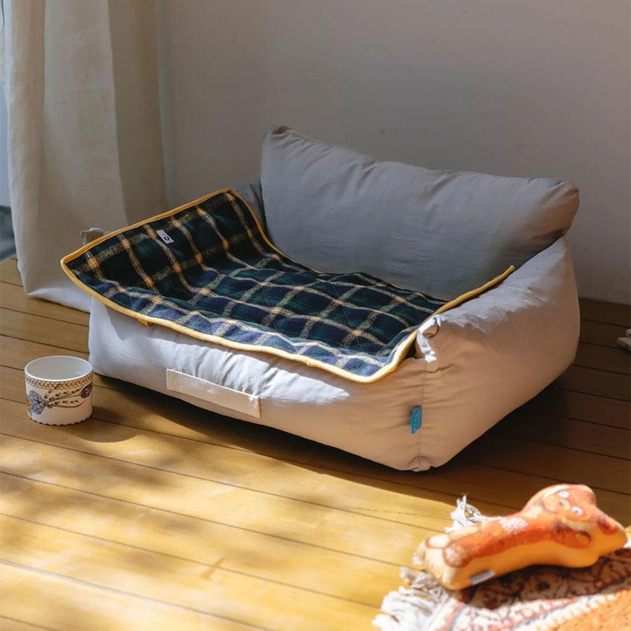 落ち着いた色合いのウール混キルティング生地は、ほどよい厚みと温かみがあり、ワンちゃんに快適なリラックススペースを提供します。