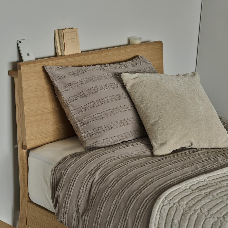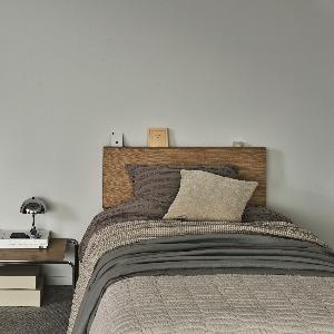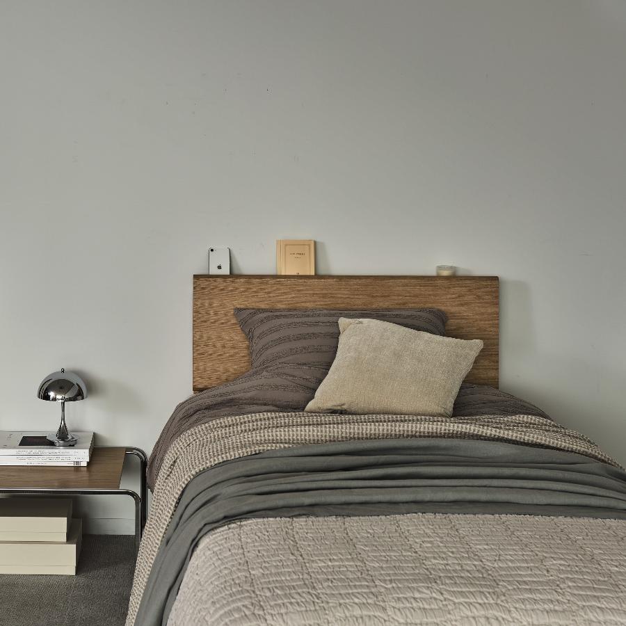 ヘッドボードには、スマートフォンや読みかけの本を置くのにちょうどいい奥行きの宮棚を備えました。