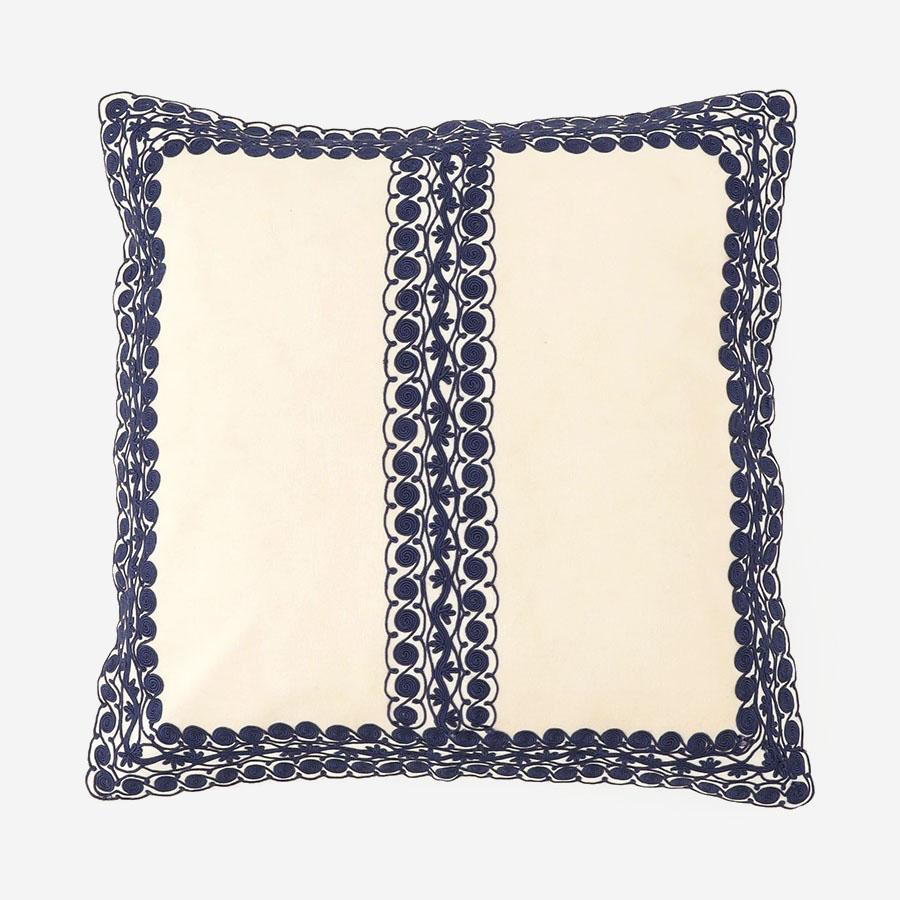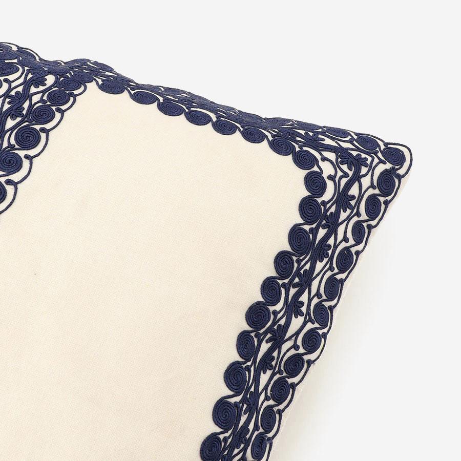 繊細な藍色のステッチがレースのように浮かび上がるDENTELLE INDIGO クッションカバー。