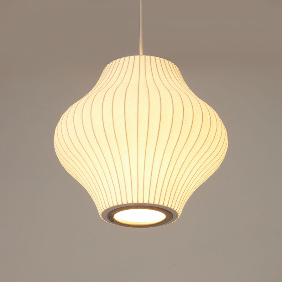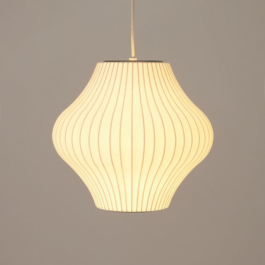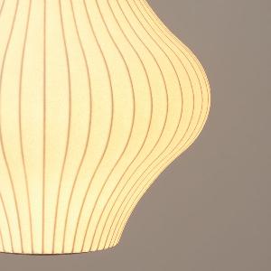 様々な形の球体から周囲にむらなく光が放たれるランプのシリーズです。ペアペンダントは、洋ナシのような柔らなフォルムで、日本の伝統的な提灯を連想させるデザインのシェードが特徴になります、