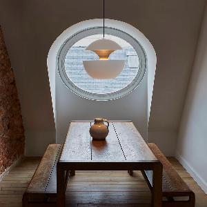 この照明器具は明かりが灯ることで雰囲気はより幻想的に雰囲気になるながら、下方向にしっかり光が届く仕様になります。間接光と直接光がひとつのランプに存在しているようで、なんとも面白いですよね。1970年に誕生して以来、いまも世界中で愛されています。