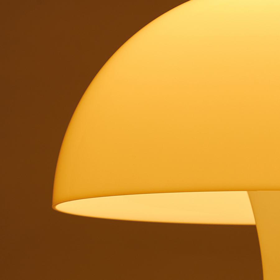 タイムレスな幾何学的フォルムのテーブルランプです。半球形シェードがグレア・フリーの柔かい拡散光を周囲の空間にひろげます。下向きの光が支柱とトランペット型のベース部分で反射され、心地よい雰囲気を作り出します。
