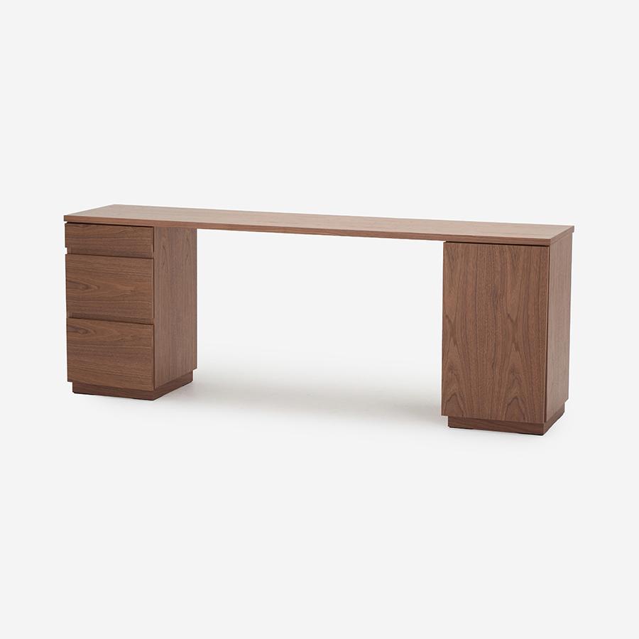 奥行きが45cmと浅く、場所を取らないためリビングの一角にスッキリと収まりやすいデスクです。両端にはチェストとドアタイプの収納があり、目的に合わせて使い分けていただけます。