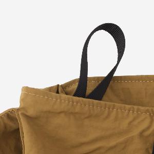 こちらのバッグはスナップボタン付きポケットの中に折りたたんで収納する仕様ですが、ポケットが少しタイトな設計のため、折りたたみ方については詳細画像をご確認ください。