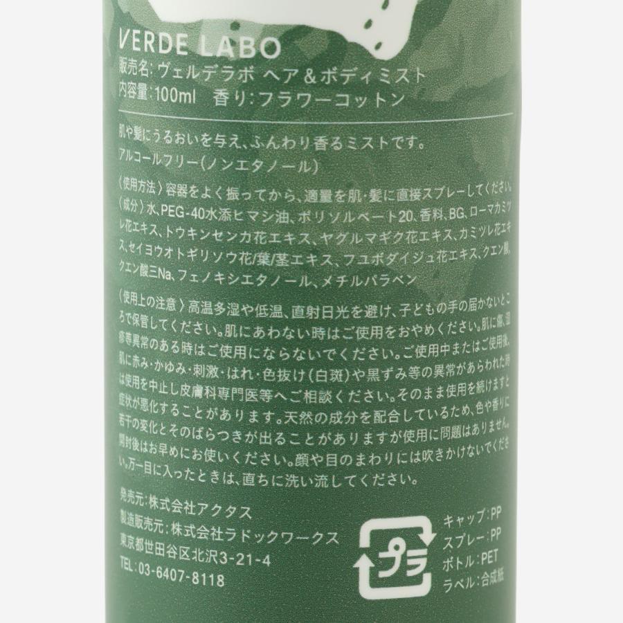 TOP > 雑貨 > バス・ボディケア > ボディケア > VERDE LABO フラワーコットン ヘア&ボディミスト 100ml