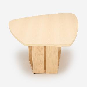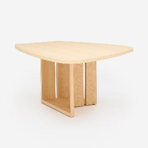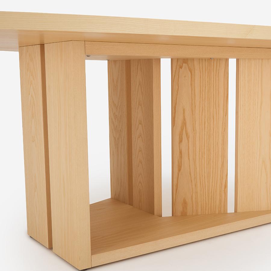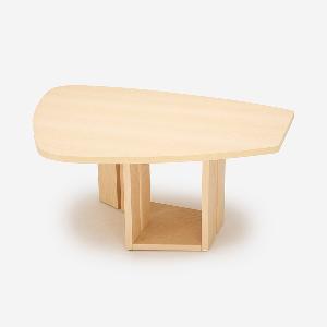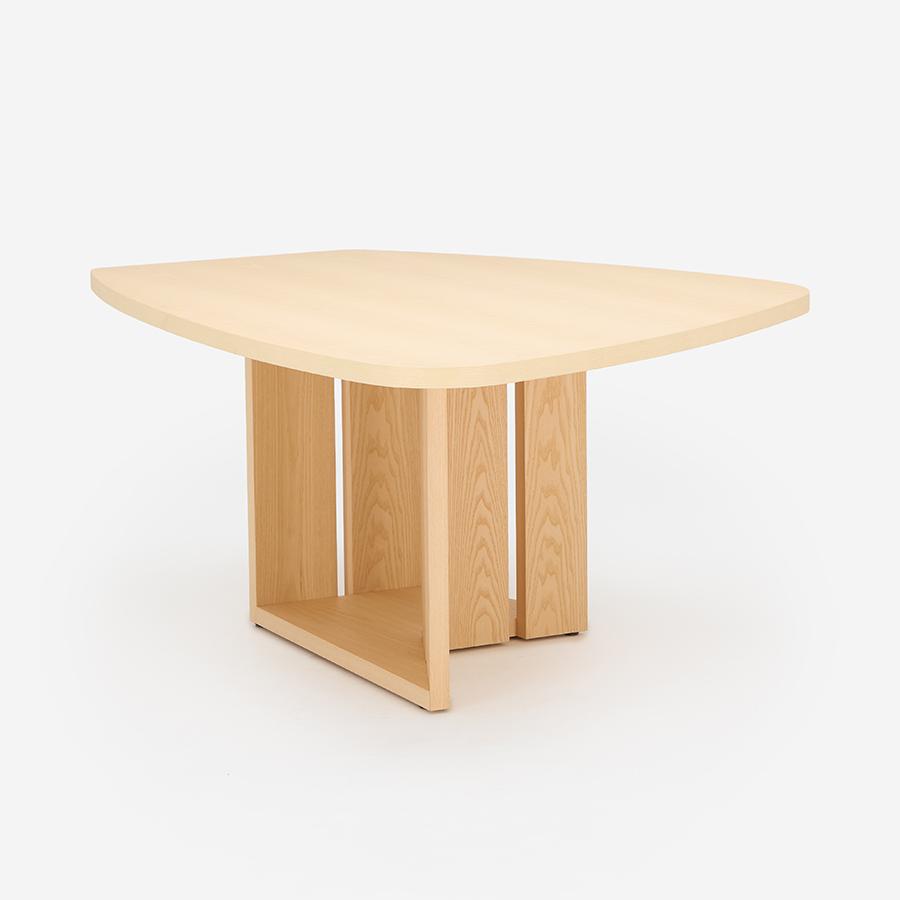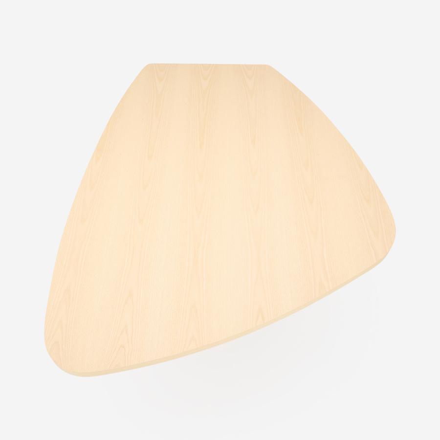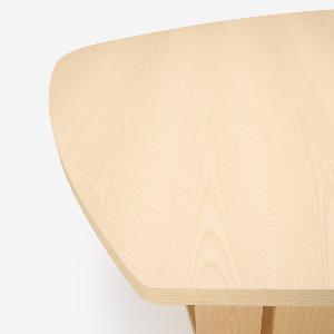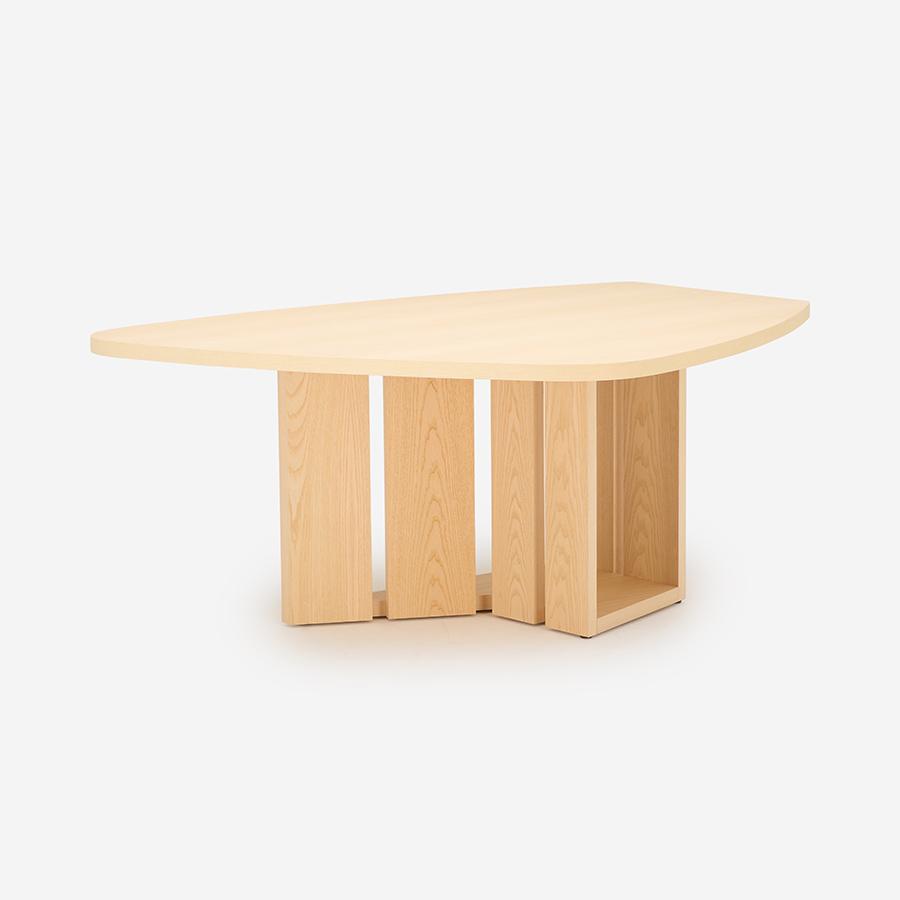 単にユニークなだけでなく、人数が限定されない木の葉のような不定形な天板は、ゲストを招いたときには大人数で座れ、微妙な視線のズレが心理的圧迫感を逃がしてくれます。また視線を自然と集めては逸らせるという絶妙な効果を生みます。家族で過ごす時間もこのカタチが効力を発揮。向かい合わないことで程よい距離が生じ、子どもが宿題をしている横で仕事をしても、互いに邪魔になりません。変形天板ですが、一部分が直線なので壁付けも可能です。