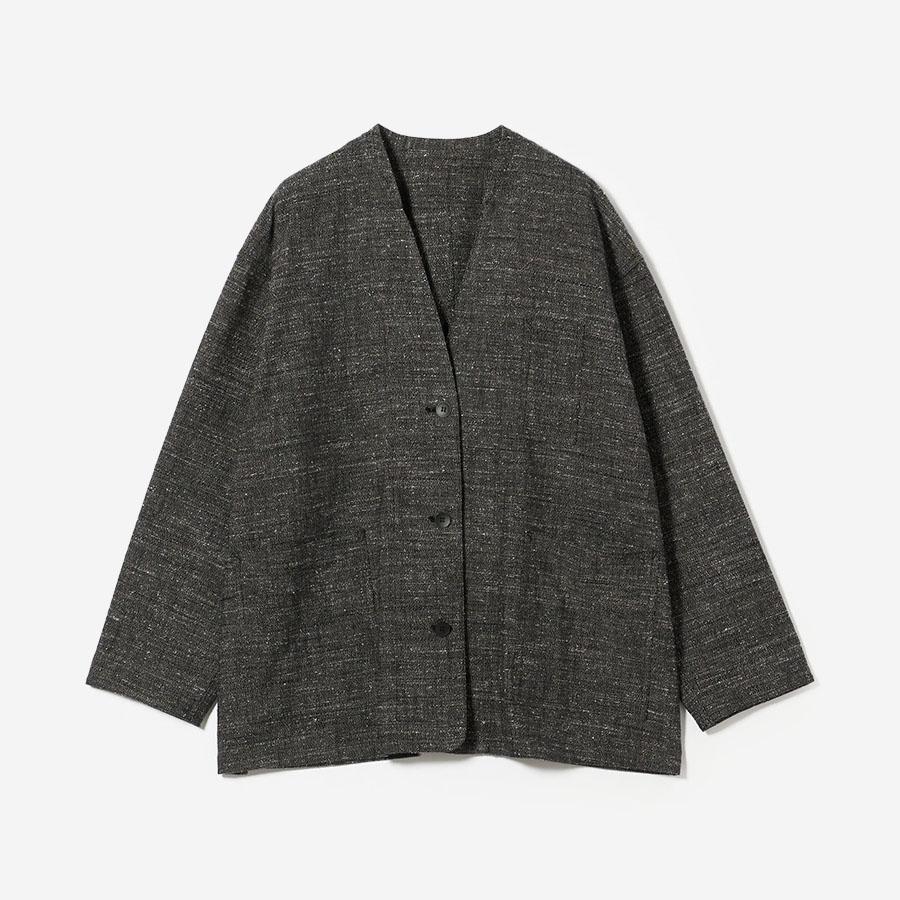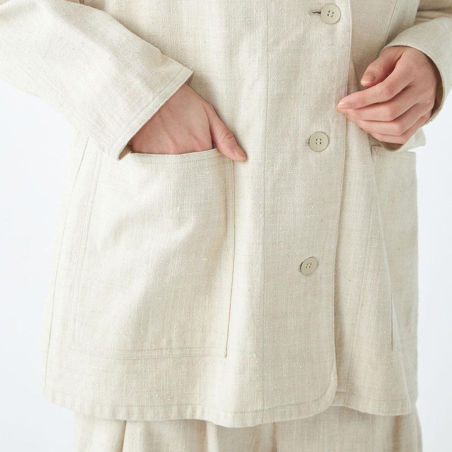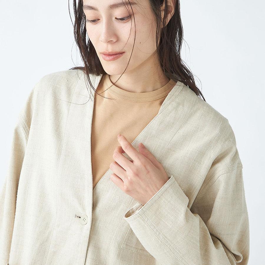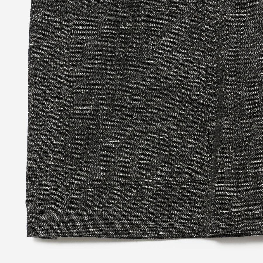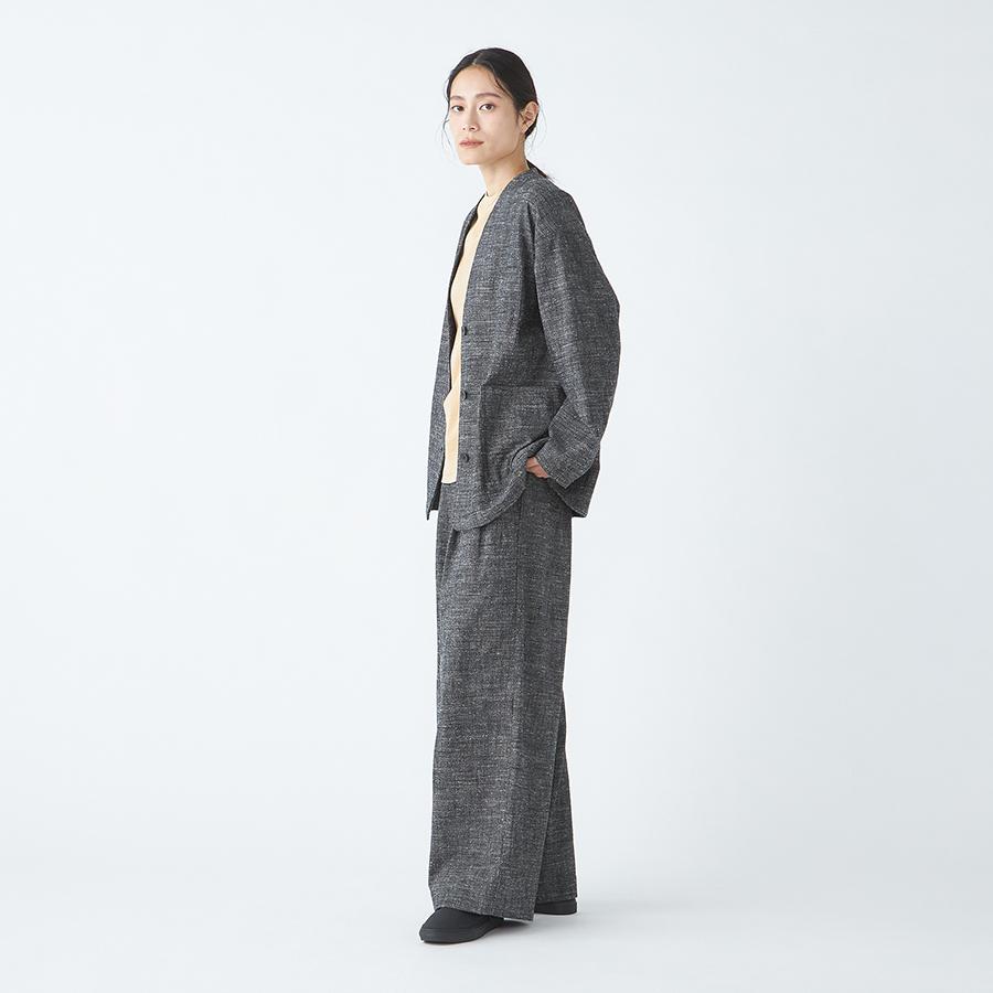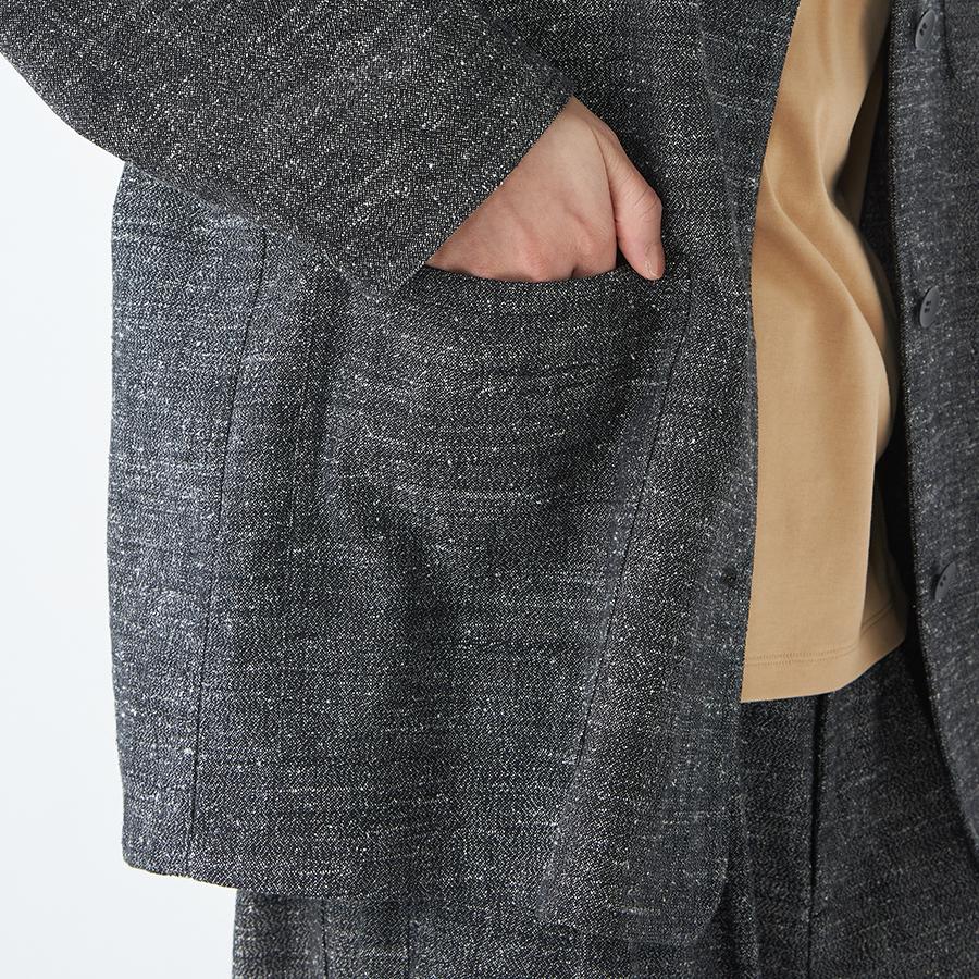 レーヨンとシルクの混紡糸を合わせたスラブネップツイード生地を使用 。シルクのネップ(糸の節)が作り出す独特の表面感と、スラブ糸によるふっくらとした表情が、上品でありながらもリラクシーな雰囲気を醸し出します。
