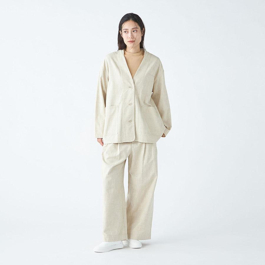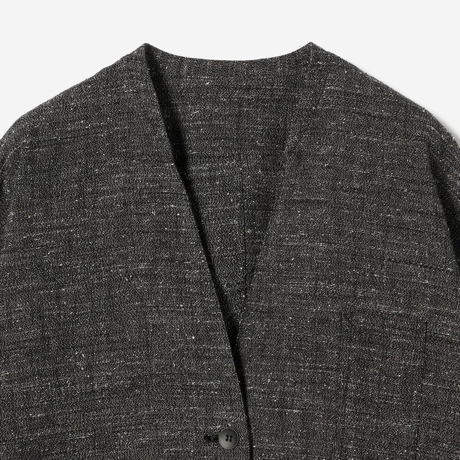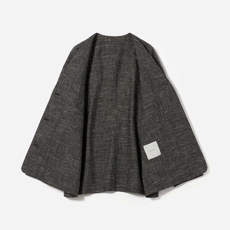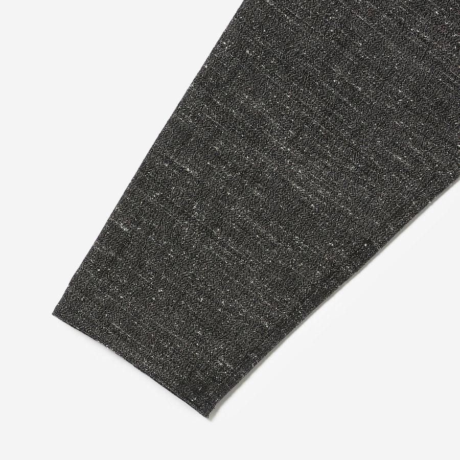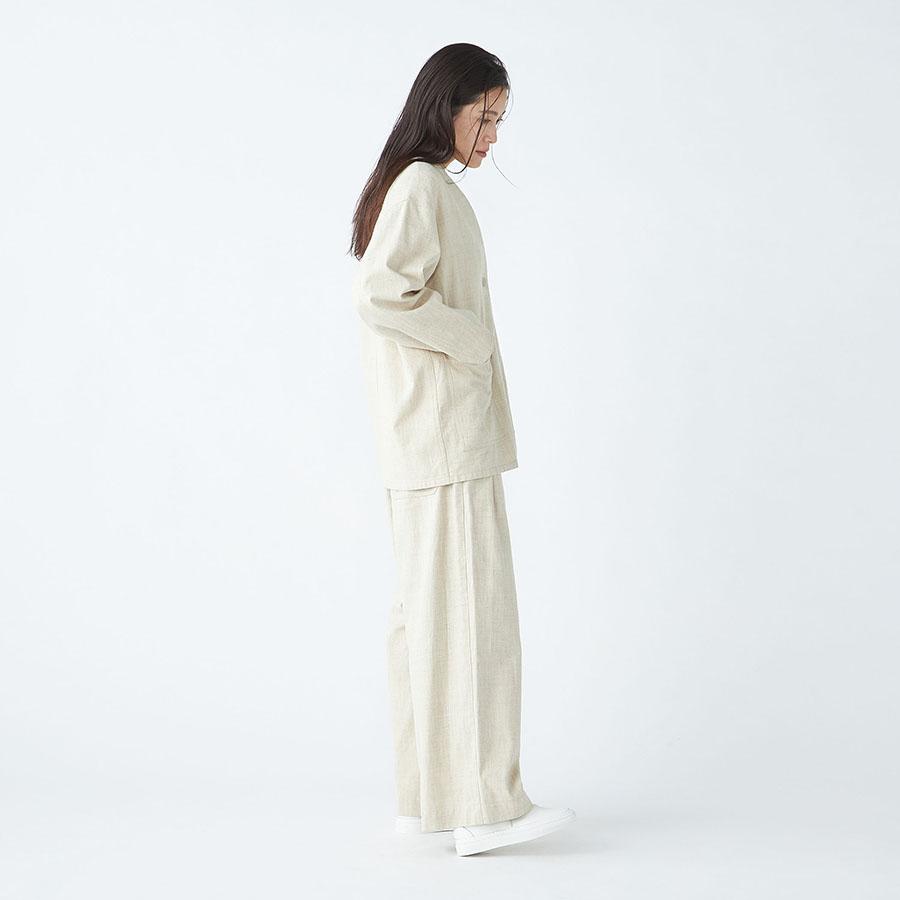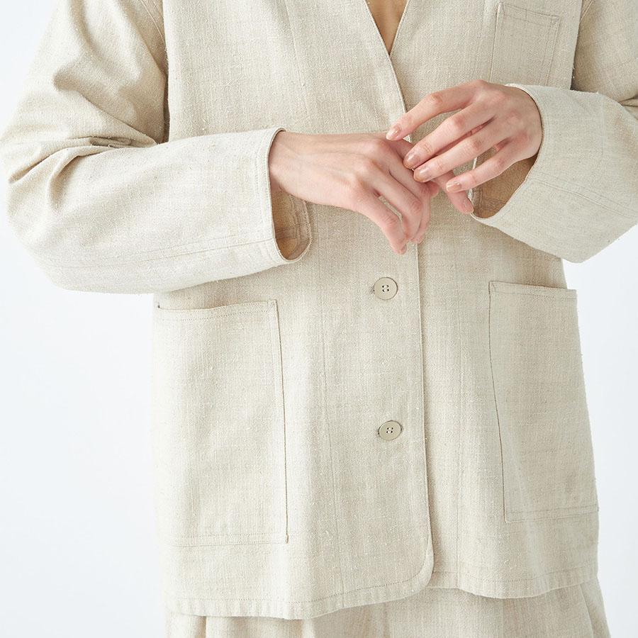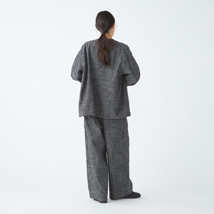 レーヨンとシルクの混紡糸を合わせたスラブネップツイード生地を使用 。シルクのネップ(糸の節)が作り出す独特の表面感と、スラブ糸によるふっくらとした表情が、上品でありながらもリラクシーな雰囲気を醸し出します。