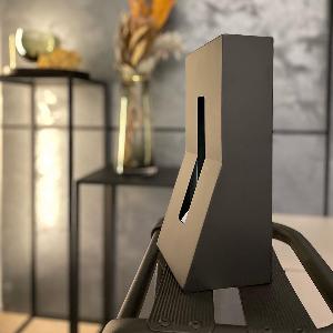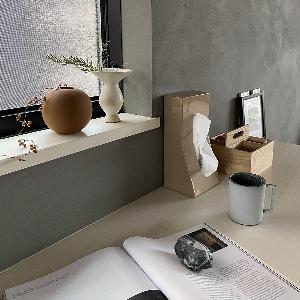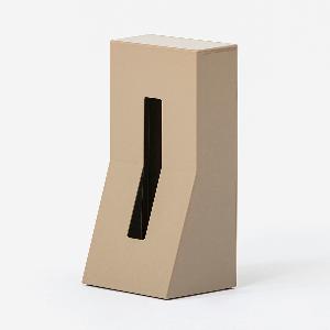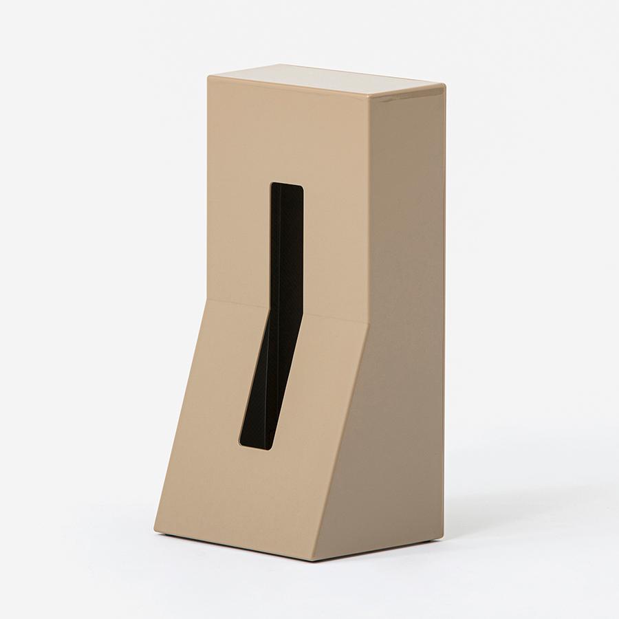 縦置き型はこの商品がきっかけとなり、現在ポピュラーなデザインとして周知されています。半分から下を手前に傾斜させたデザインは、ティッシュを引き抜く際の転倒を防ぐと同時に機能から導かれた形状は室内の風景を邪魔せず、機能美に優れたアイテムです。