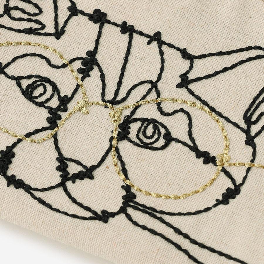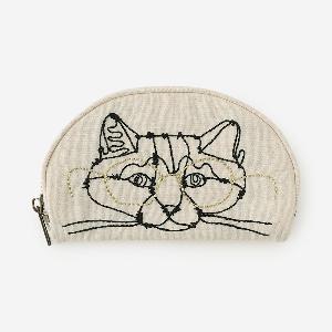 刺繍で表現されたメガネをかけたネコのモチーフが愛らしいポーチです。