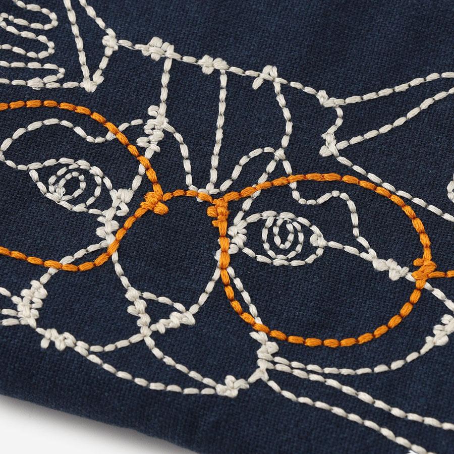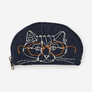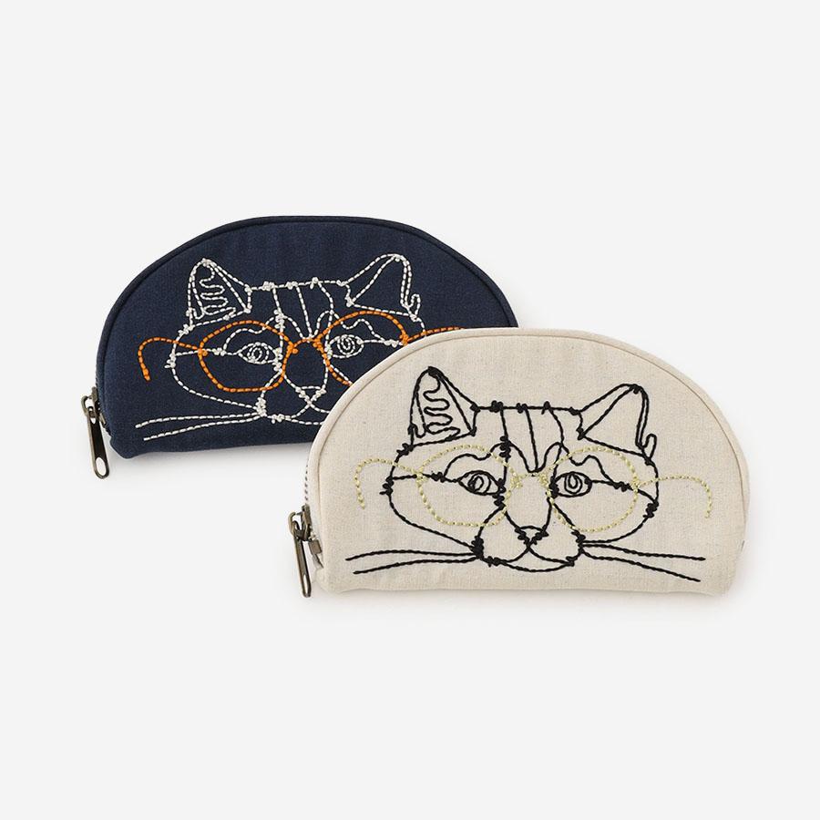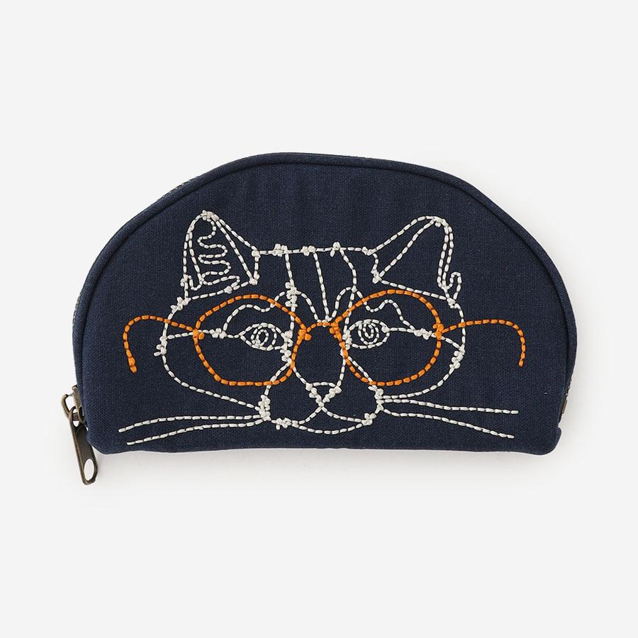 刺繍で表現されたメガネをかけたネコのモチーフが愛らしいポーチです。